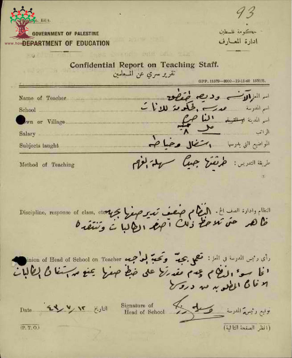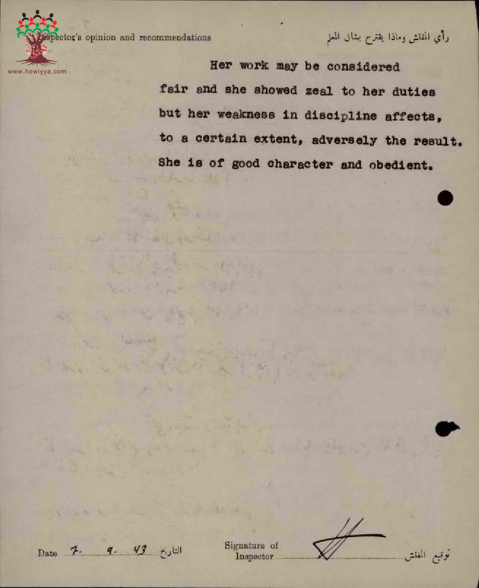 تقرير تفصيلي عن أداء المعلمة وديعة طقطق في مدرسة الناصرة للبنات سنة 1943
