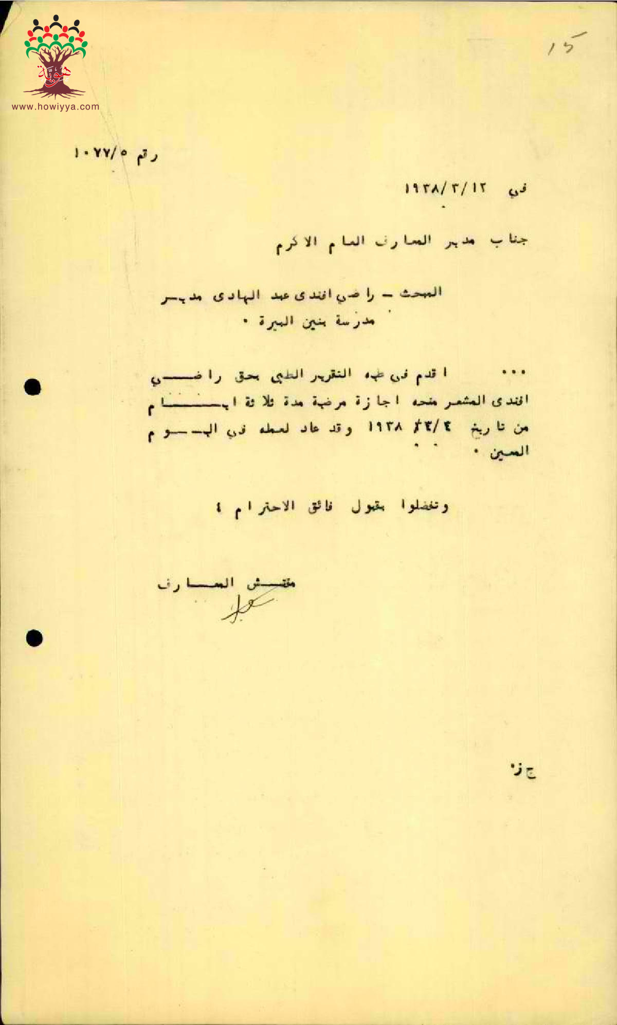رسالة من مفتش المعارف الى مدير المعارف بخصوص اجازة مرضية للمعلم راضي عبد الهادي وعودته للعمل
