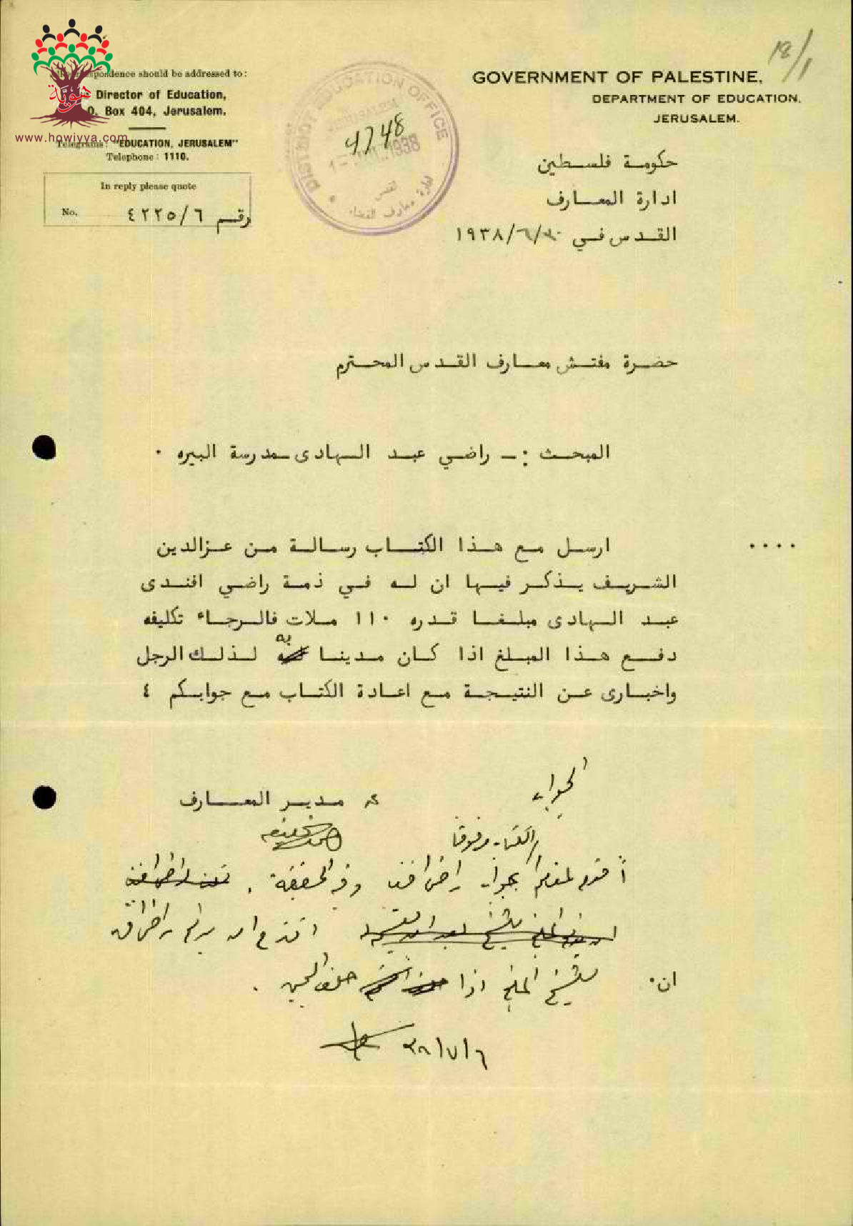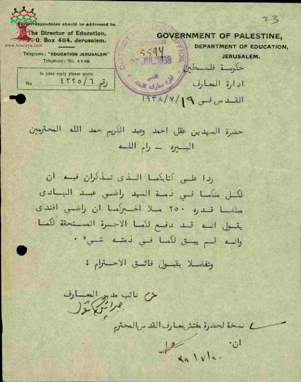 مجموعة رسائل بخصوص مشكلة الدين بين المعلم راضي عبد الهادي والسيد عز الدين الشريف