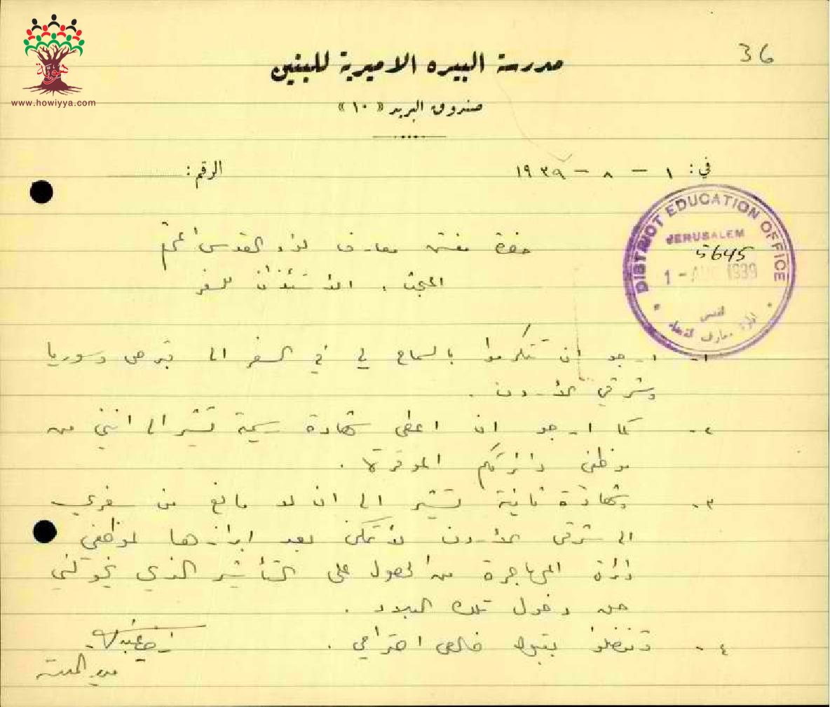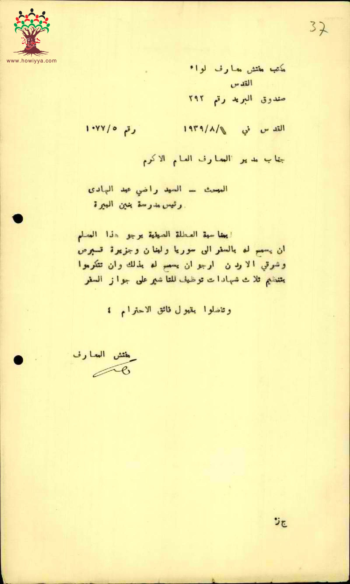 رسالة من مفتش المعارف الى مدير المعارف مرفقة برسالة من المعلم راضي عبد الهادي يستأذن فيها بالسفر الى خارج فلسطين خلال العطلة الصيفية وتحديدا الى سوريا ولبنان وقبرص وشرقي الأردن