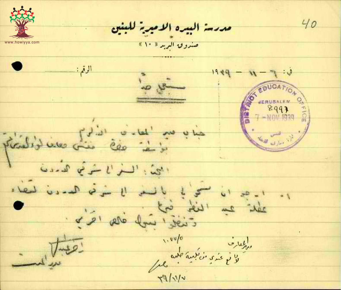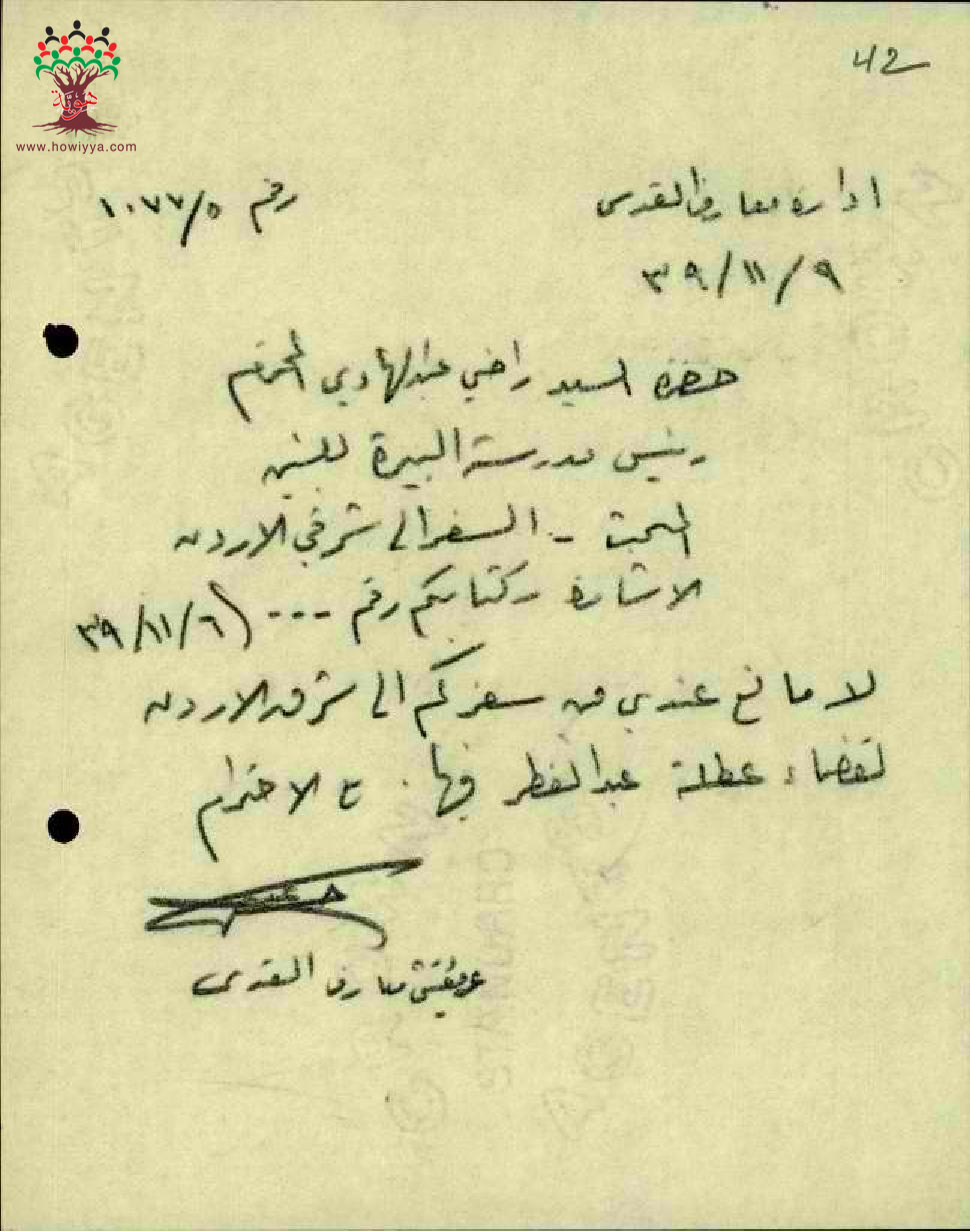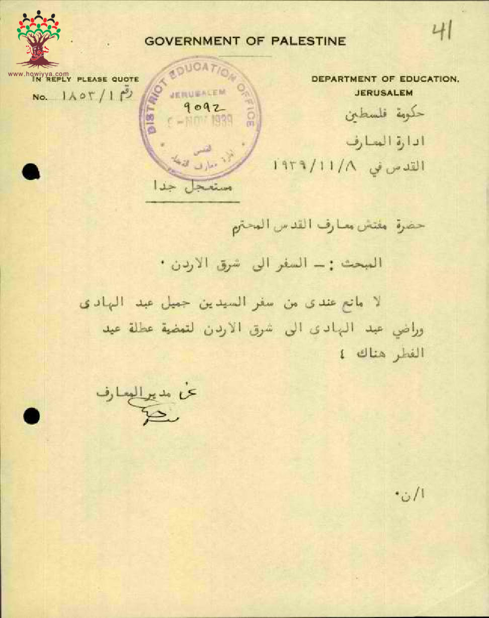 مجموعة رسائل بخصوص الاذن للمعلم راضي عبد الهادي بالسفر الى شرقي الأردن خلال عطلة عيد الفطر