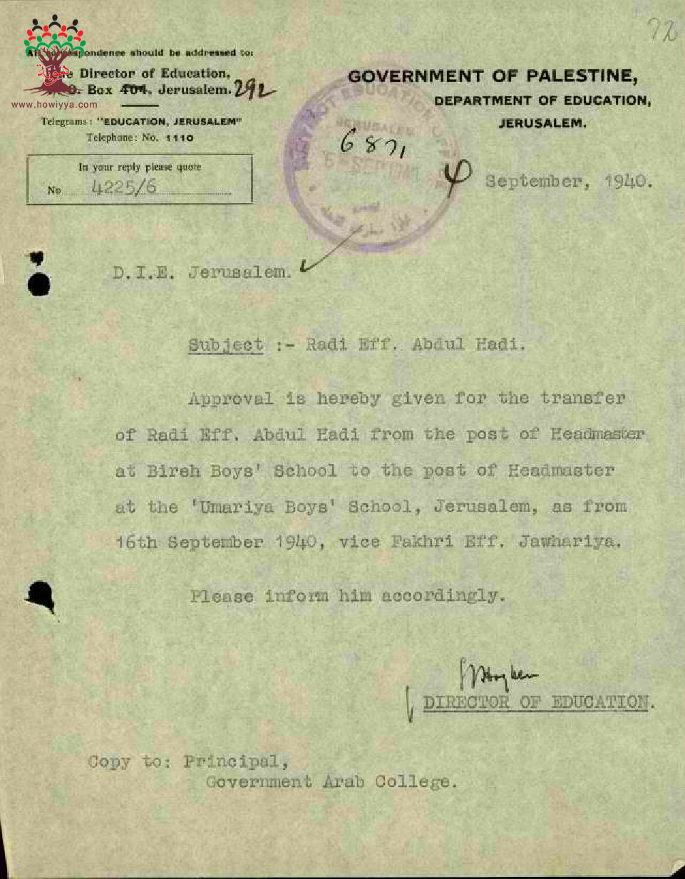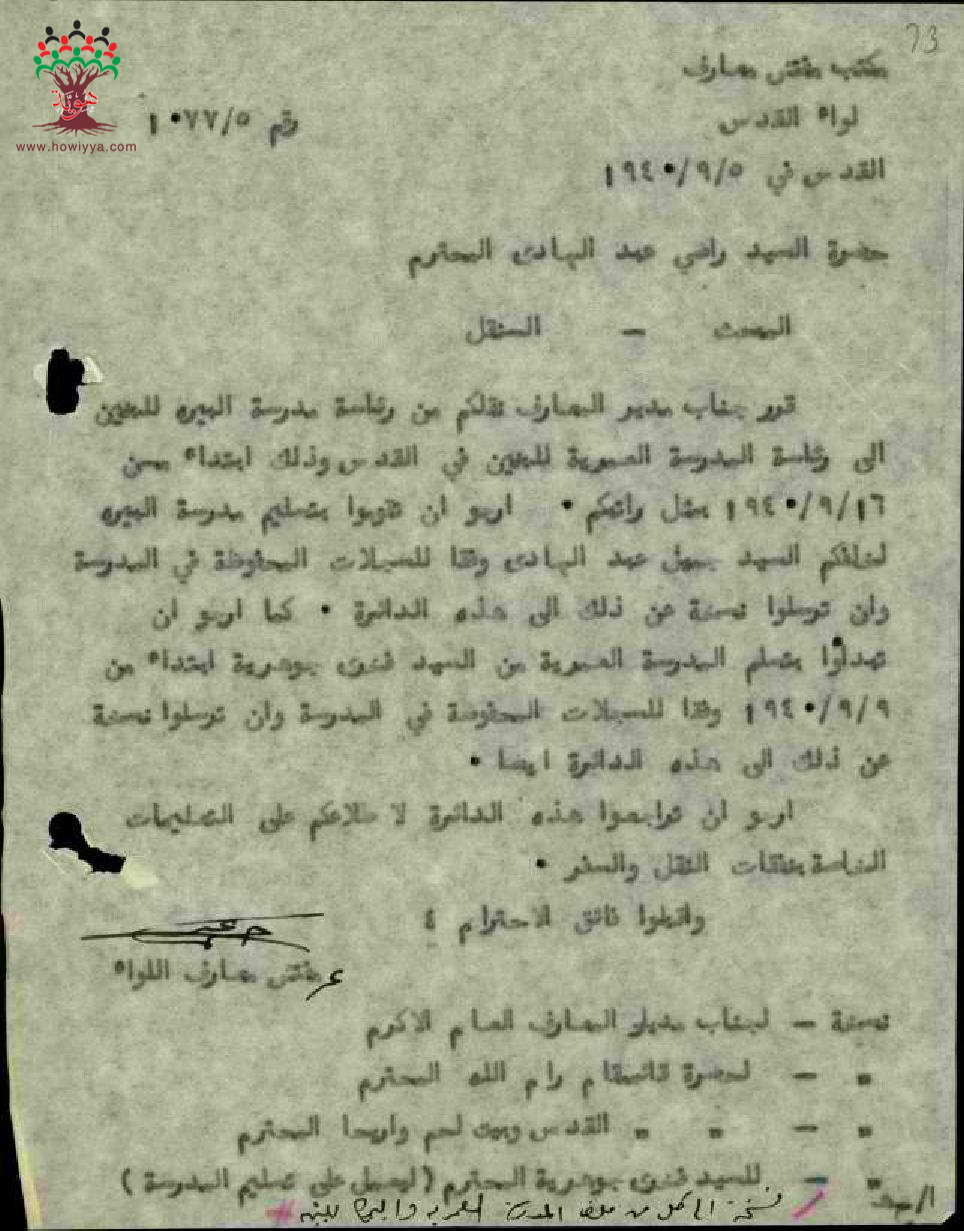 رسائل بخصوص نقل المعلم راضي عبد الهادي من مدرسة البيرة الى مدرسة العمرية في القدس