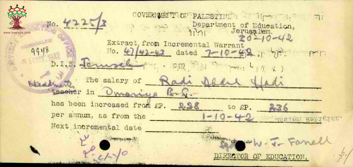 رسالة من مدير المعارف الى مفتش المعارف بخصوص زيادة راتب المعلم راضي عبد الهادي السنوية