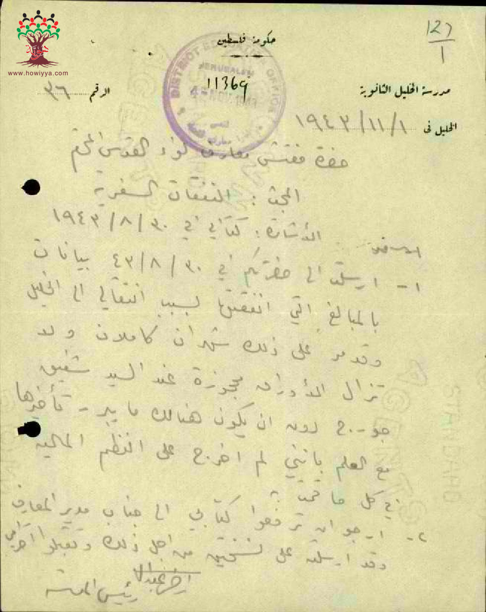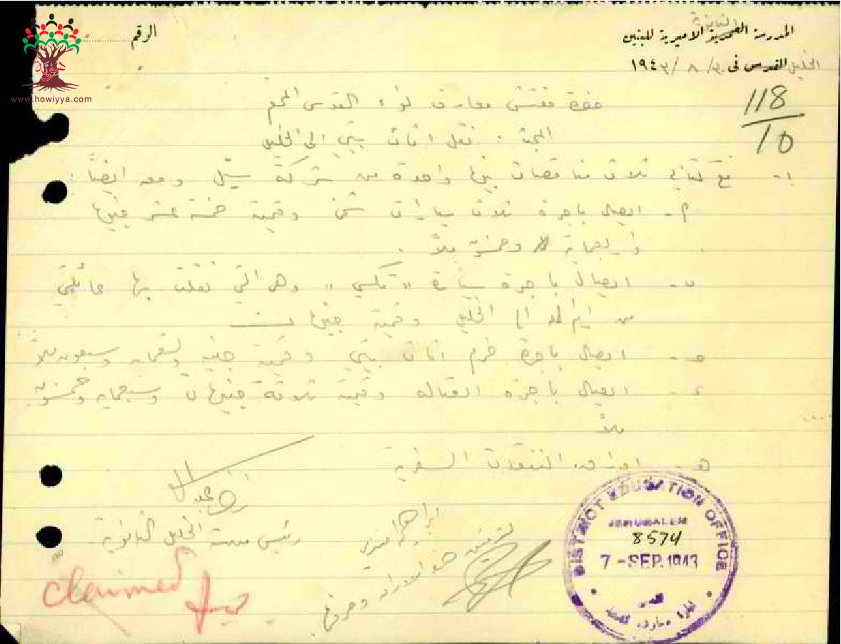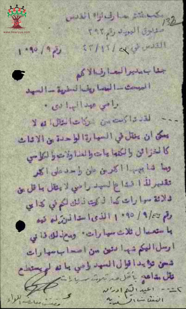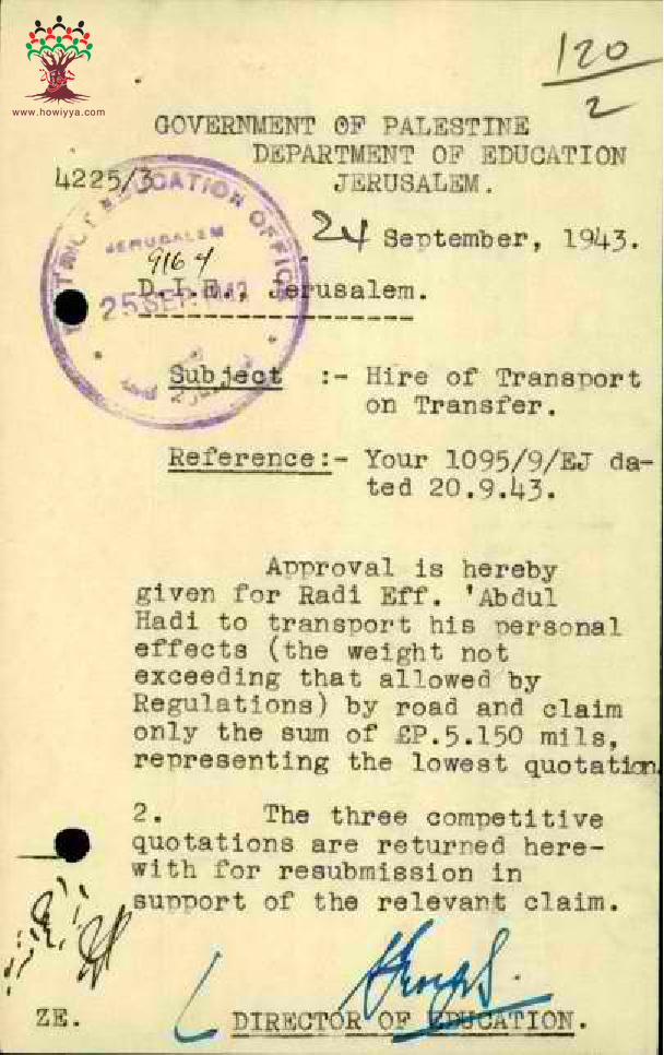 مجموعة رسائل بخصوص مصاريف نقل اثاث وتكاليف سفر المعلم راضي عبد الهادي