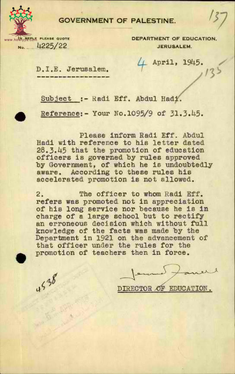 رسالة من مدير المعارف الى مفتش المعارف بخصوص عدم امكانية ترقية المعلم راضي عبد الهادي