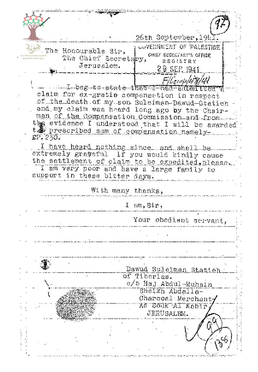 طلب تعويض مقدم من داود استيتية الى السكرتير العام