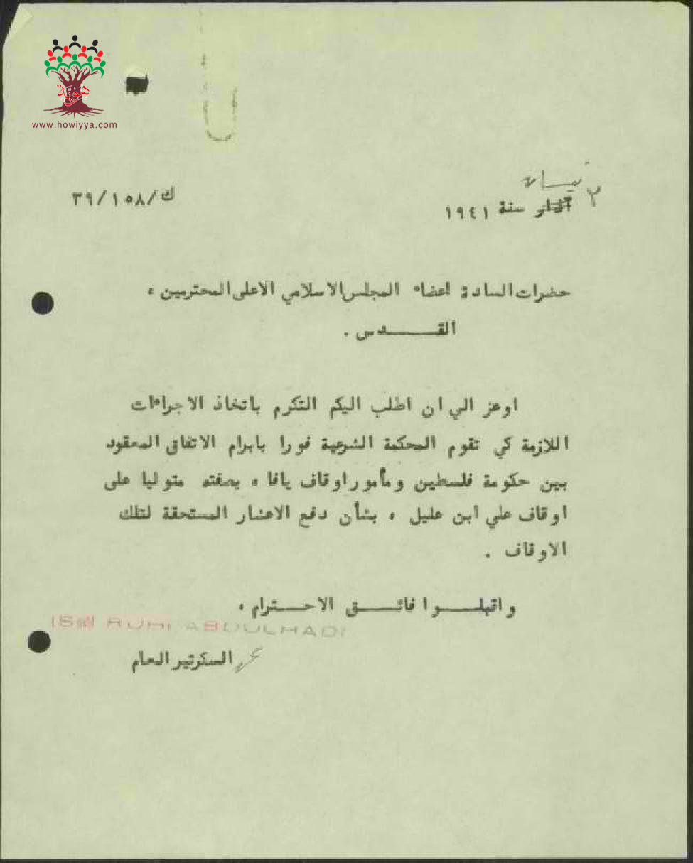 مجموعة رسائل من السكرتير العام الى المجلس الاسلامي الأعلى بخصوص الاتفاق حول وقف علي بن عليل ودفع المستحقات للأوقاف