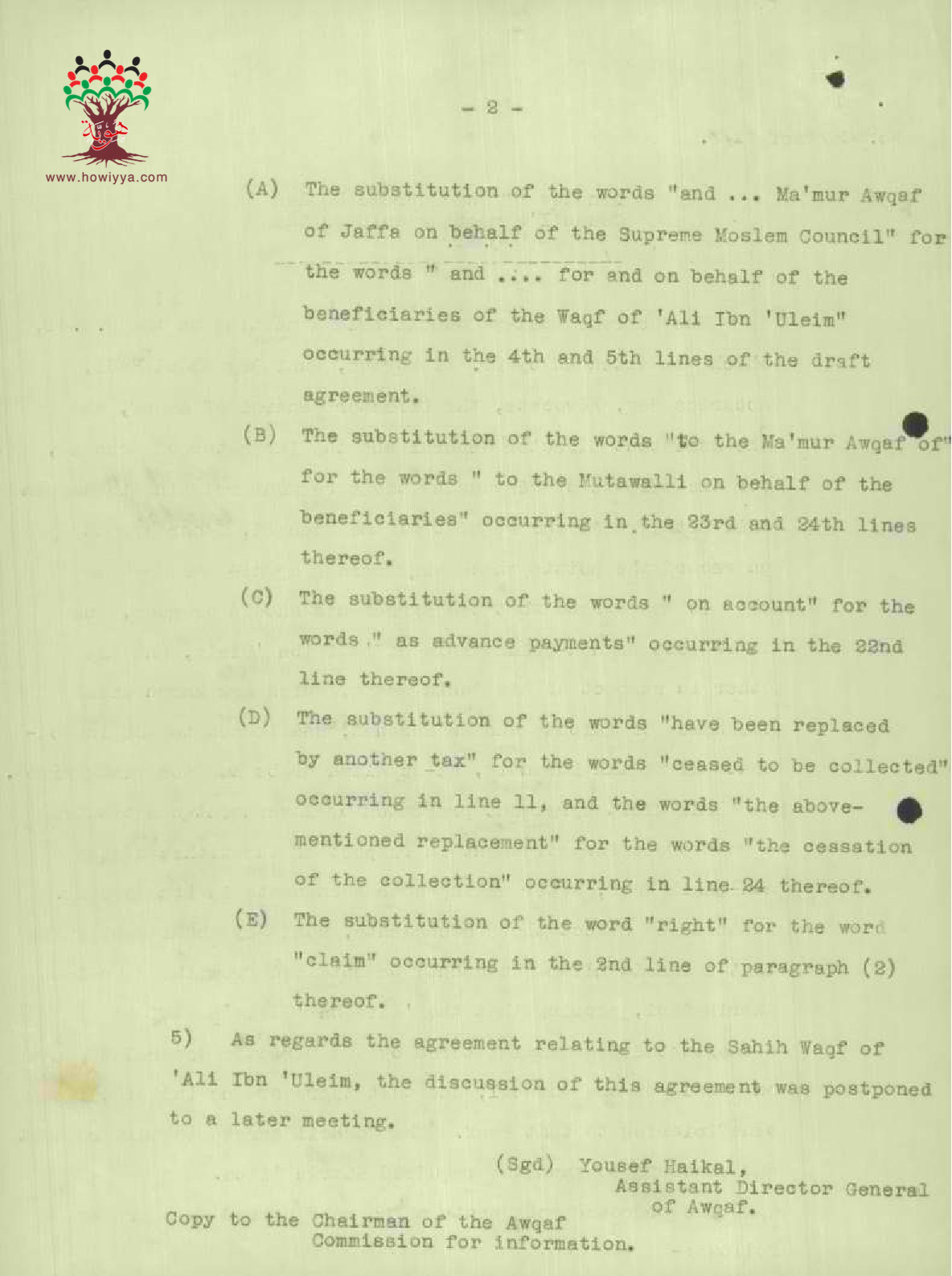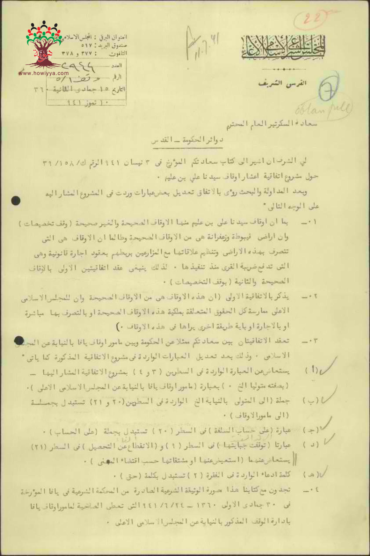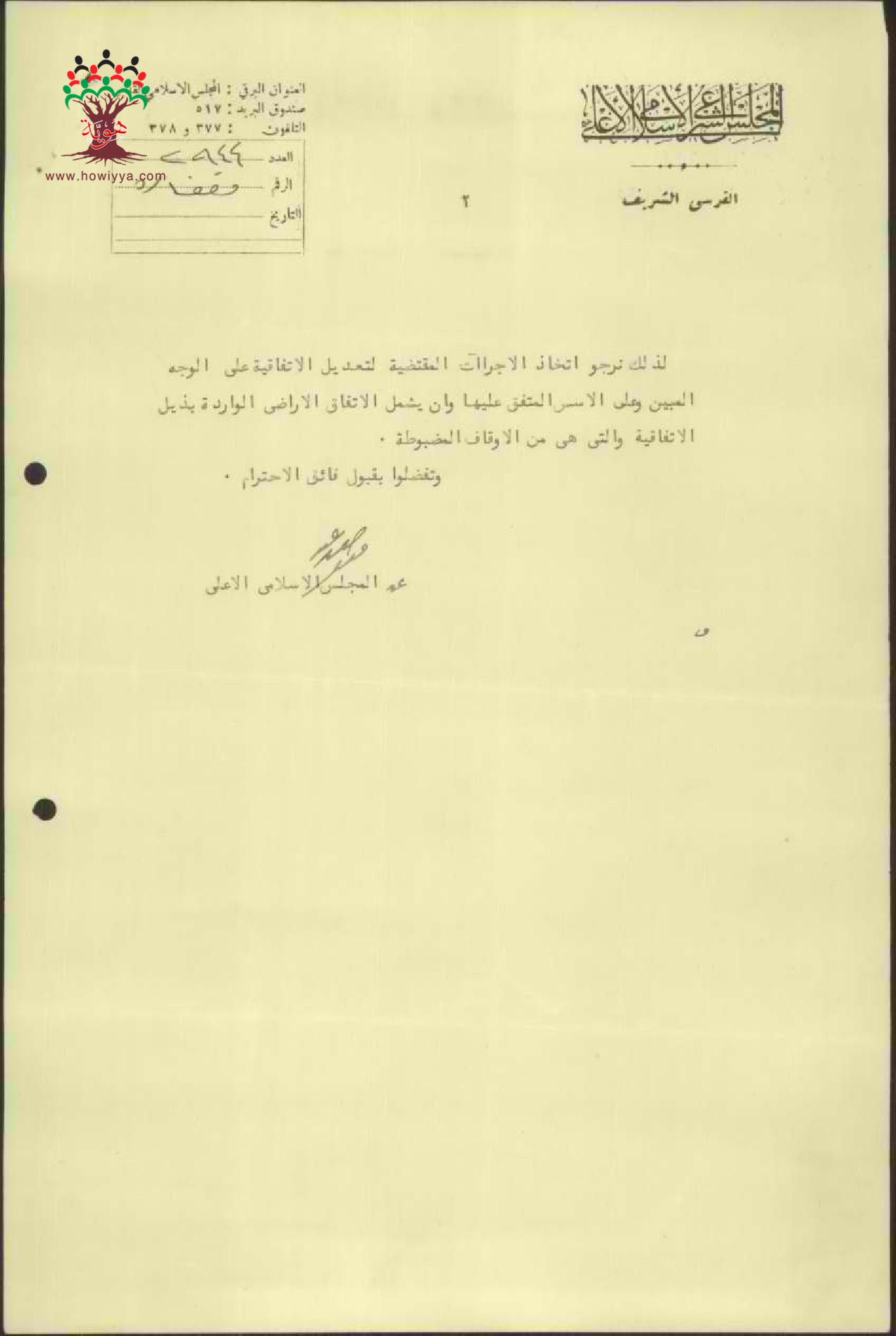رسالة من المجلس الاسلامي الأعلى الى السكرتير العام يطلب فيها تعديل الاتفاق حول وقف علب بن عليل