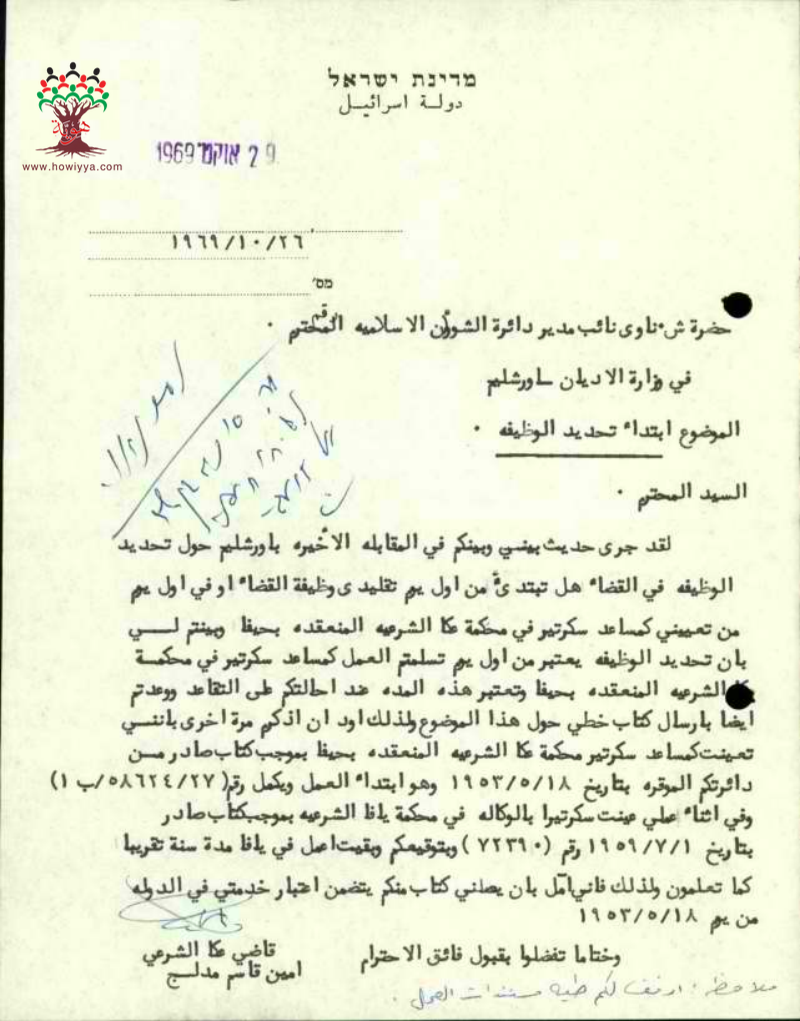 رسالة من أمين قاسم مدلج الى نائب مدير دائرة الشؤون الاسلامية بخصوص ابتداء تحديد وظيفته