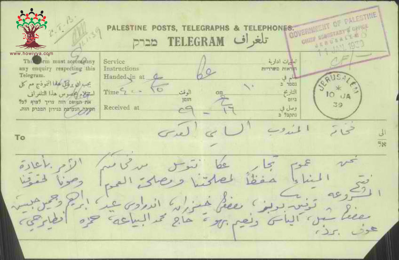 رسالة من عموم تجار عكا الى المندوب السامي يطالبون بإعادة فتح ميناء عكا