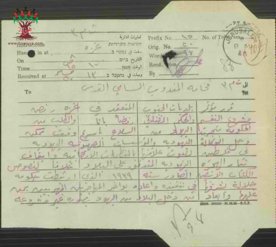 تلغراف مرسل من لجنة مؤتمر بلديات الجنوب الى المندوب السامي احتجاجا على استمرار الهجرة اليهودية الى فلسطين