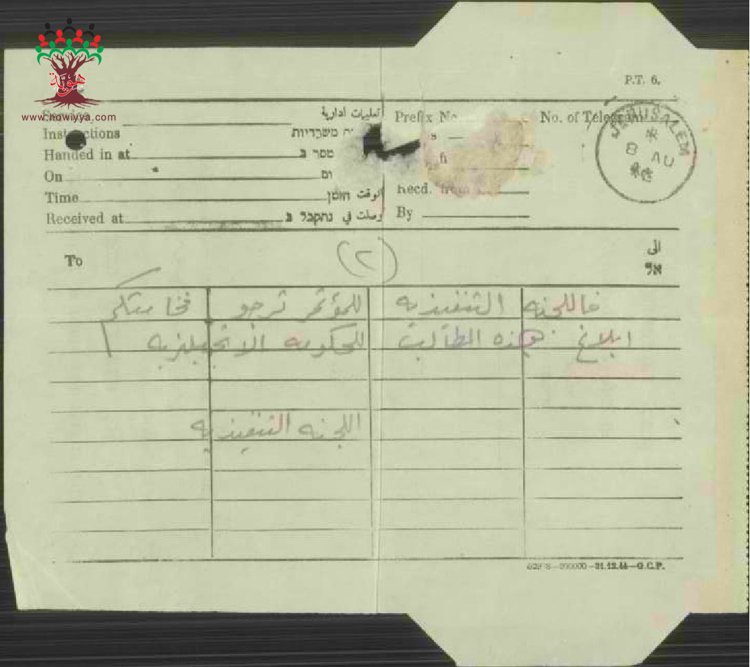 تلغراف مرسل من لجنة مؤتمر بلديات الجنوب الى المندوب السامي احتجاجا على استمرار الهجرة اليهودية الى فلسطين وتطالب بتجريد اليهود من السلاح لحفظ الأمن في البلاد