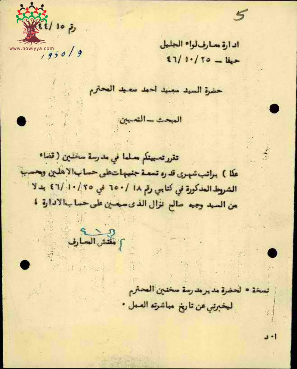 تعيين المعلم سعيد أحمد سعيد في مدرسة سخنين/قضاء عكا