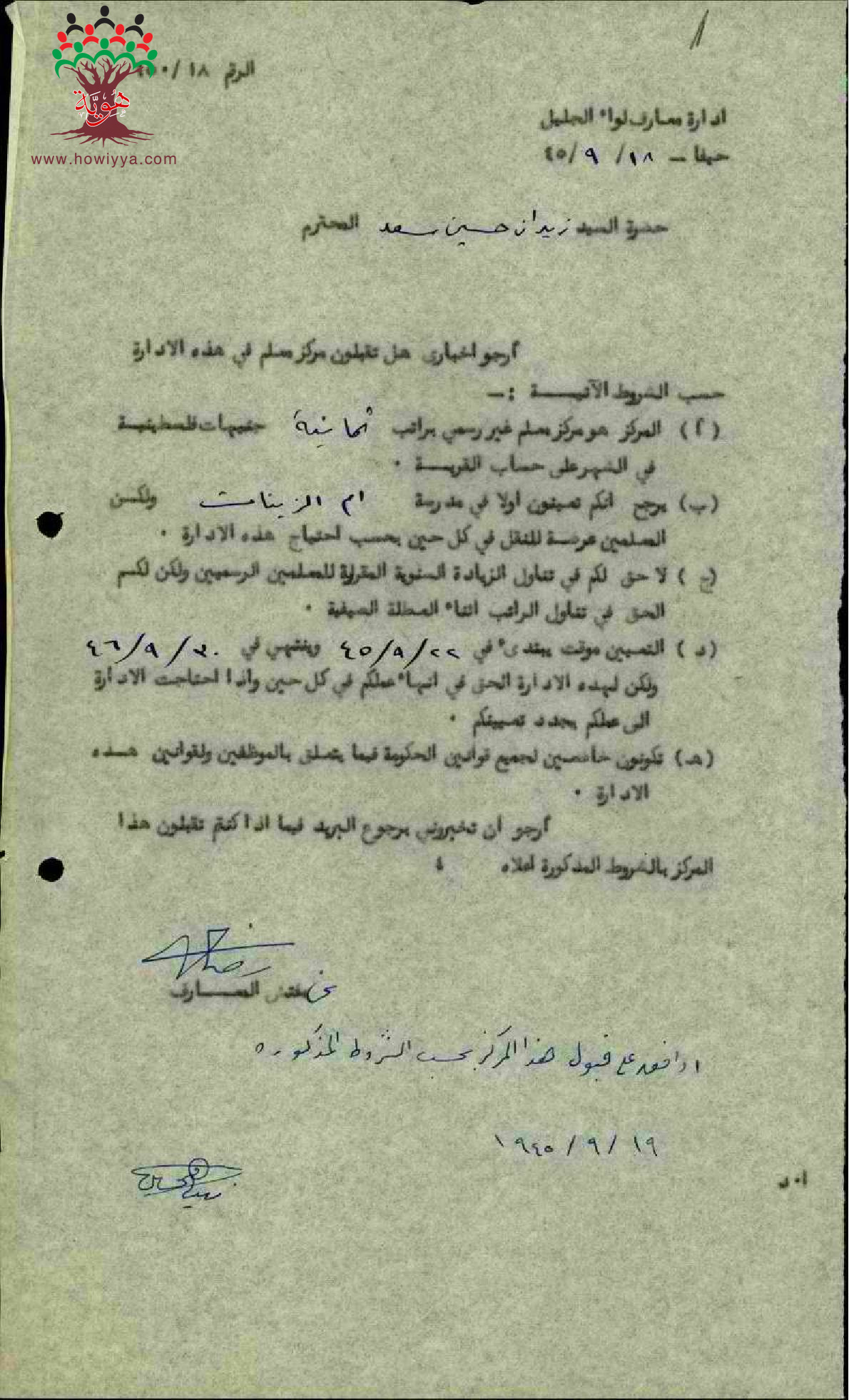 رسالة من مفتش المعارف الى المعلم زيدان السعد يعرض فيه مركز معلم غير رسمي في مدرسة أم الزينات