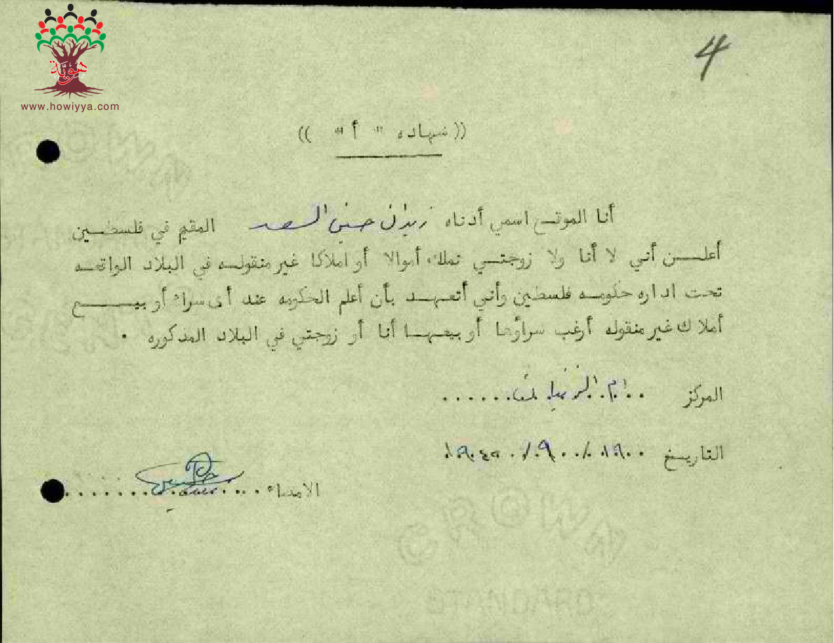 شهادة نفي ملكية المعلم زيدان السعد - عين غزال - مدرسة أم الزينات