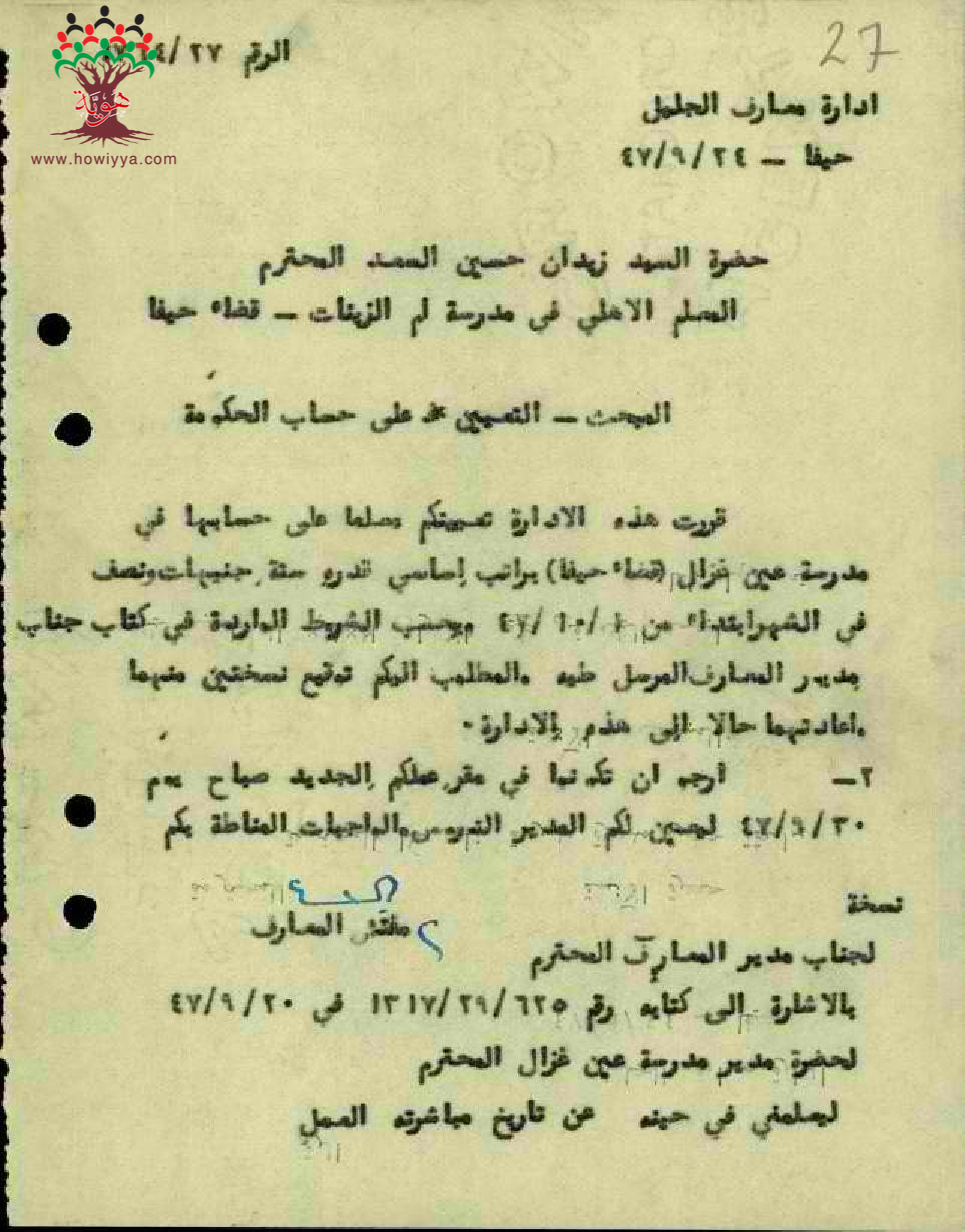 رسالة من مفتش المعارف الى المعلم زيدان السعد بخصوص تعيينه في مدرسة عين غزال على حساب الحكومة