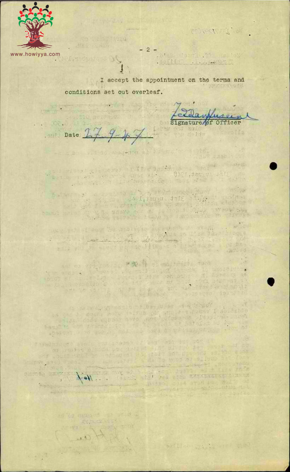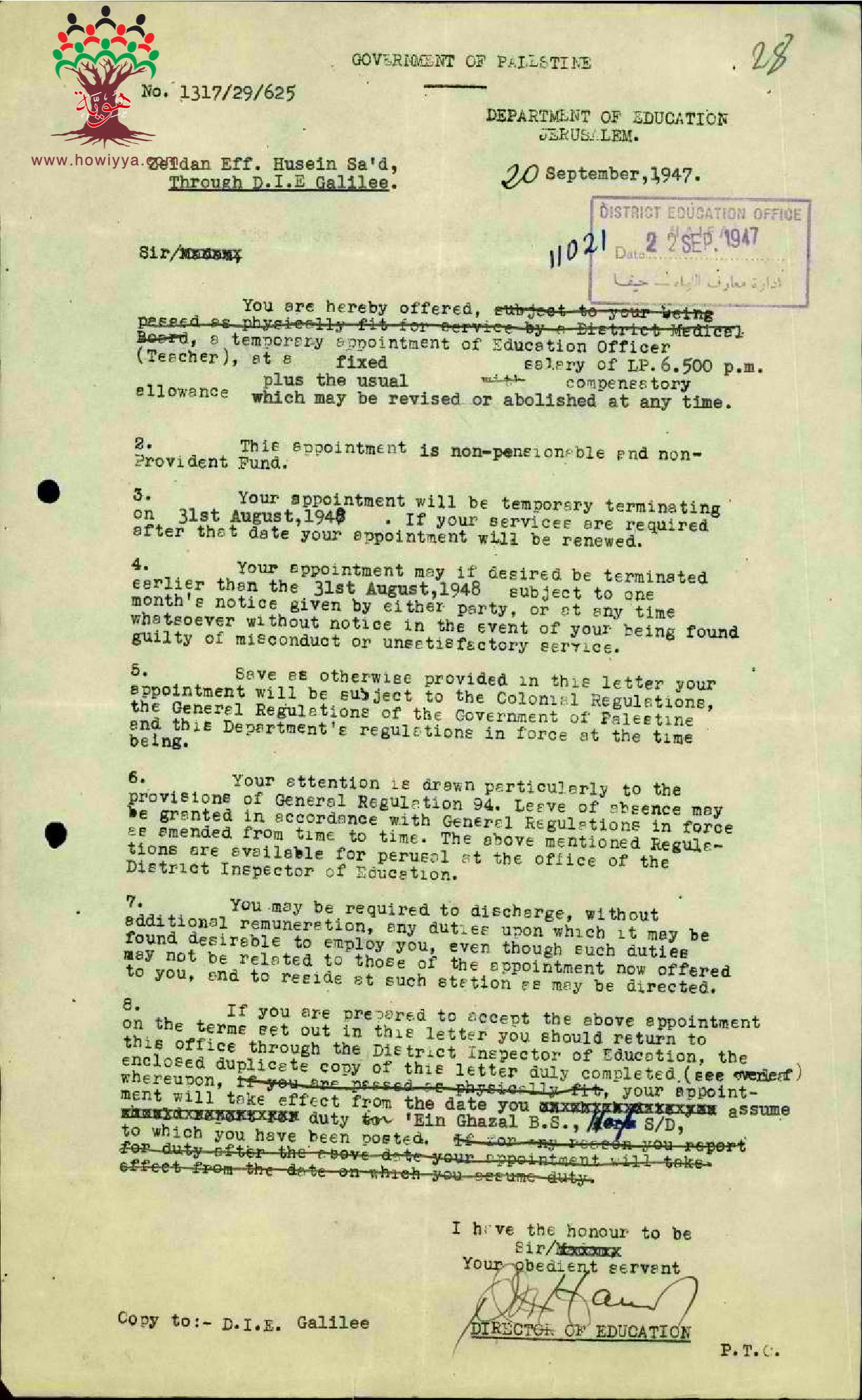 توقيع المعلم زيدان لسعد على شروط تعيينه في مدرسة عين غزال