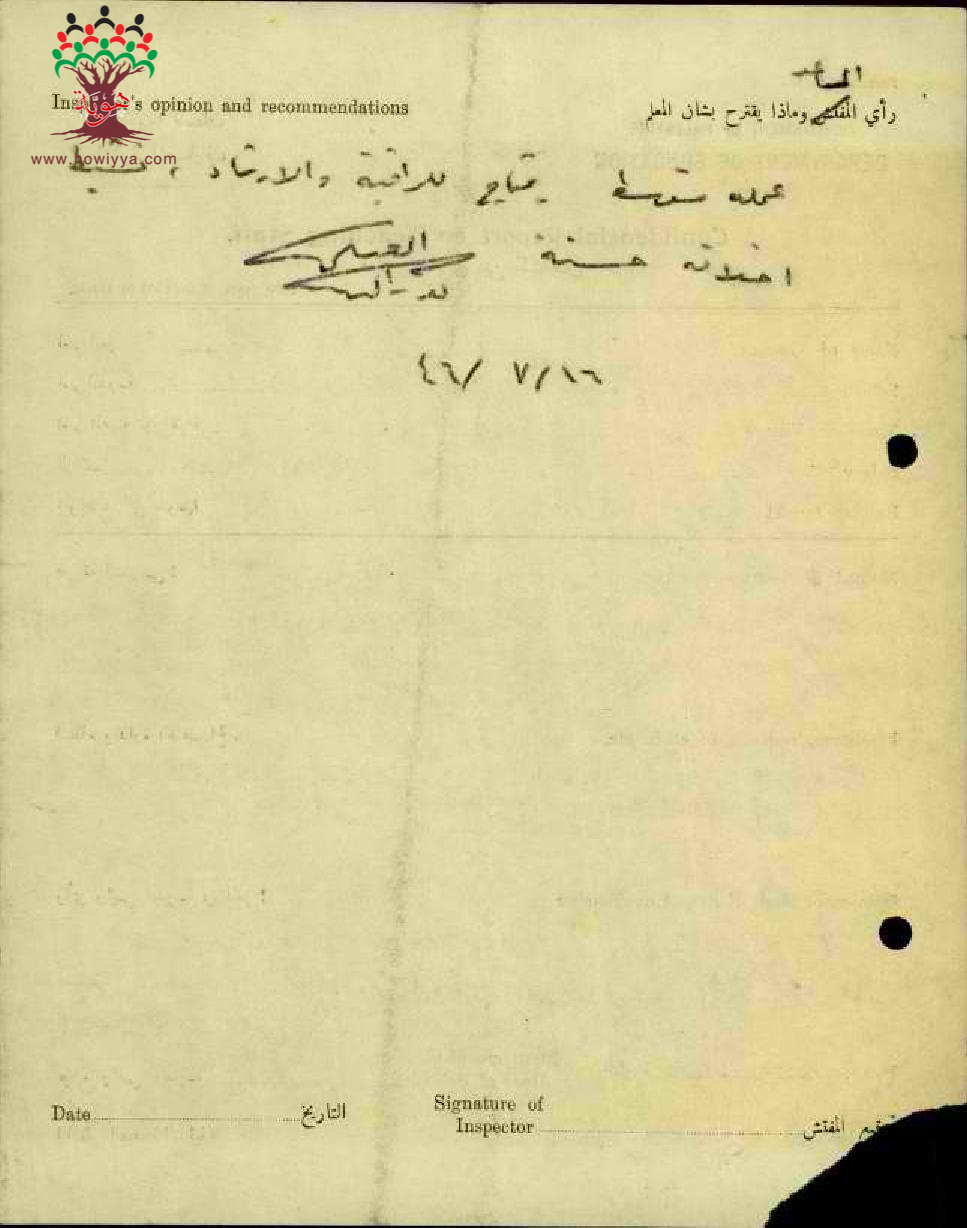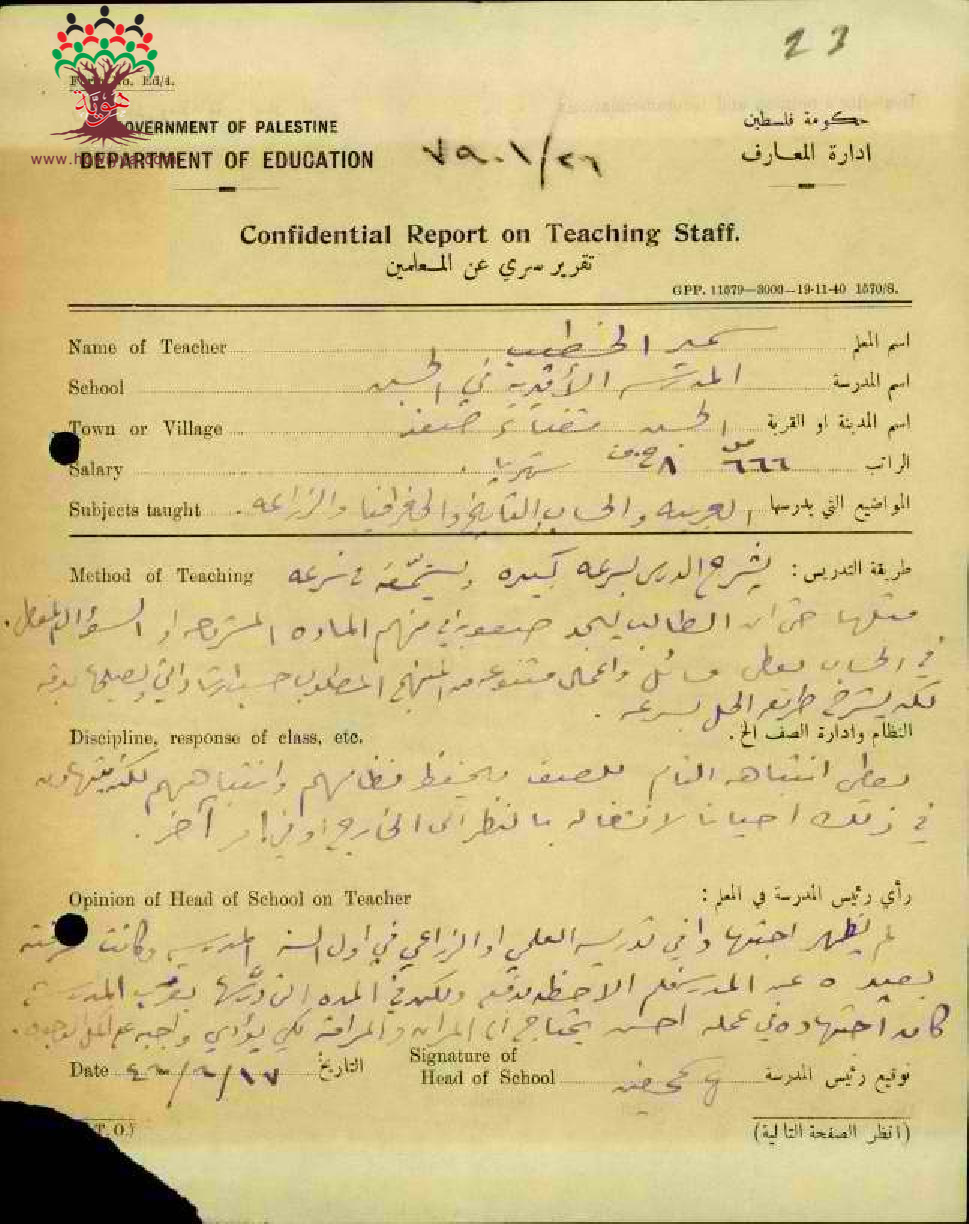 تقرير تفصيلي عن أداء المعلم سمير محيي الدين الخطيب في مدرسة الجش سنة 1946