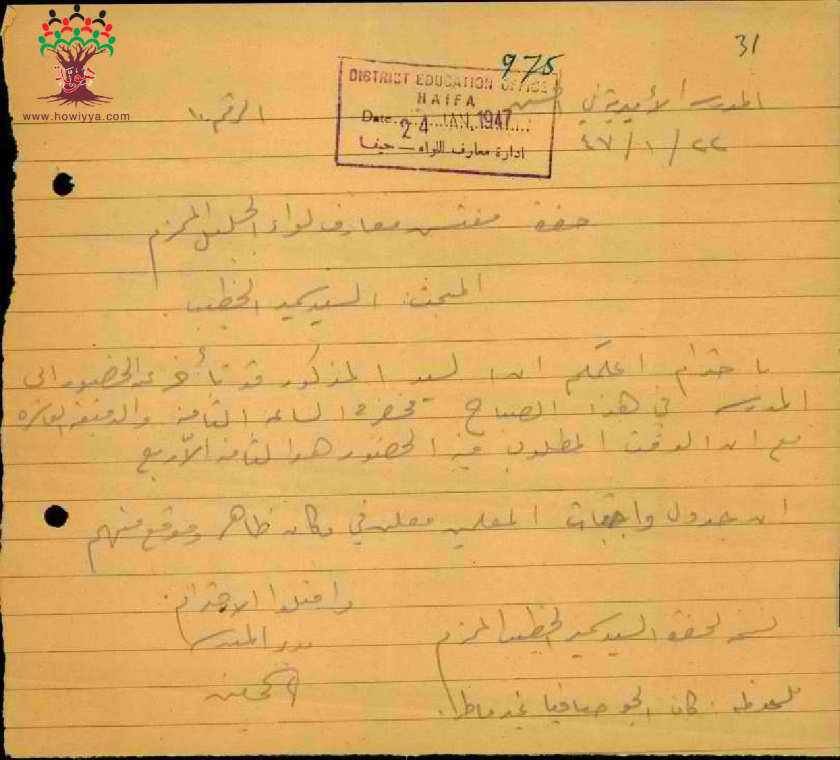 رسالة من مدير مدرسة الجش الى مفتش المعارف بخصوص تأخر المعلم سمير الخطيب عن العمل
