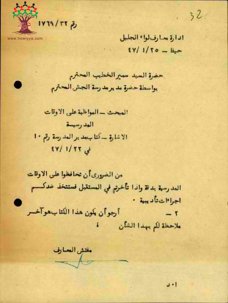 رسالة من مفتش المعارف الى المعلم سمير الخطيب بخصوص المواظبة على مواعيد العمل