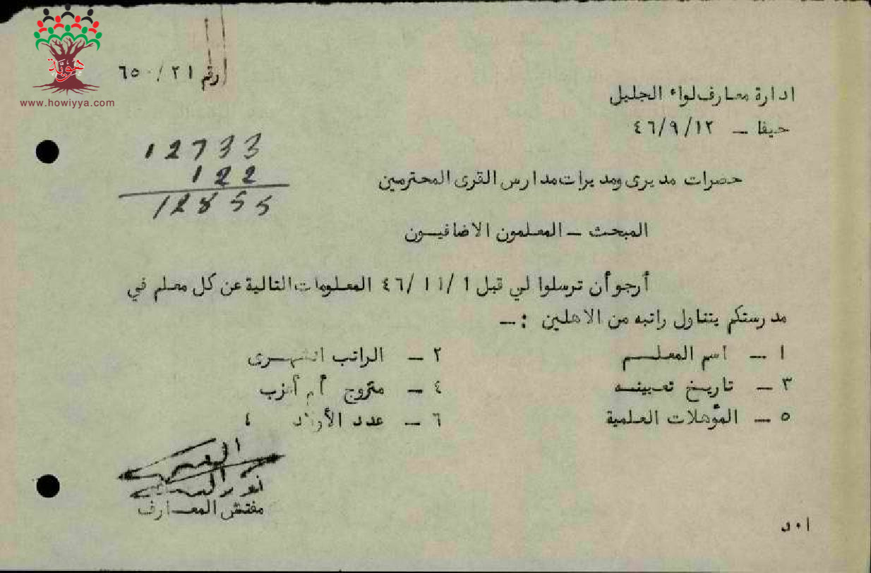 رسالة من مفتش المعارف الى مدراء ومديرات المدارس يطلب فيها معلومات عن المعلمين والمعلمات في الدرجات الغير نظامية