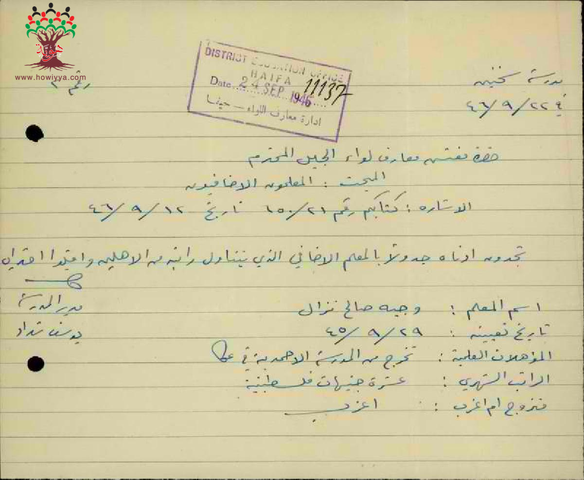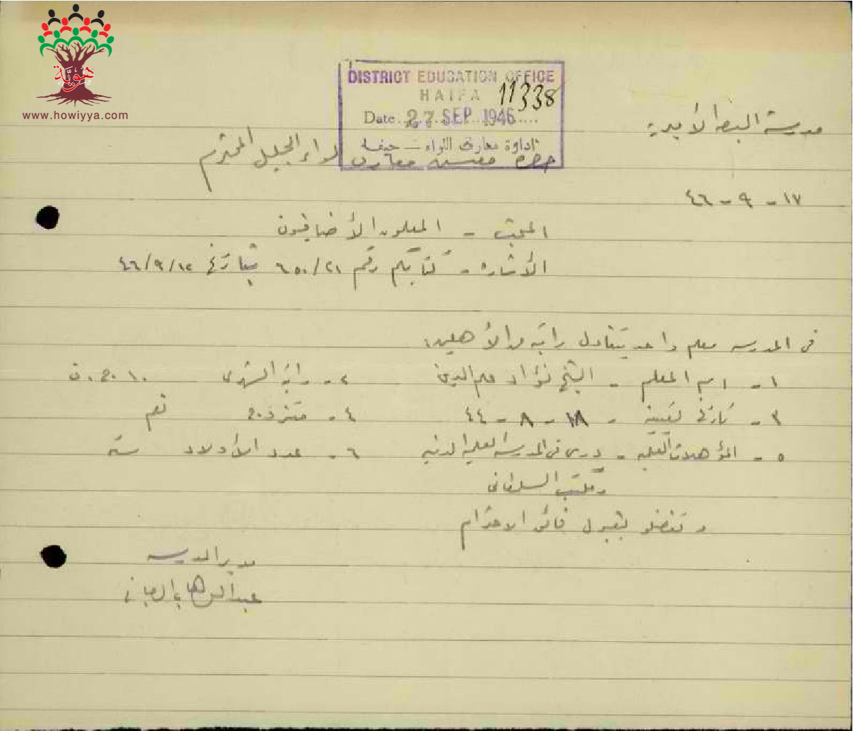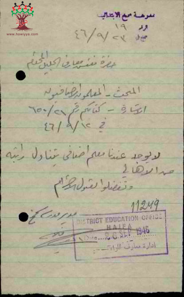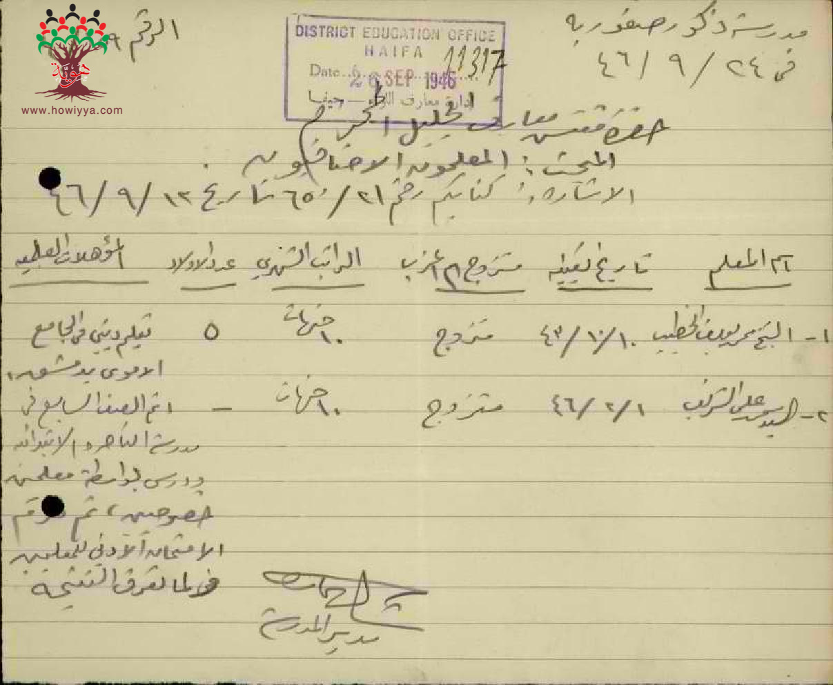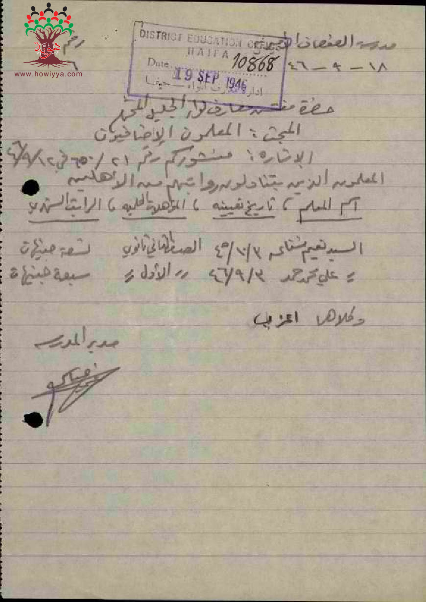 مجموعة رسائل من مدراء ومديرات المدارس الحكومية الى مفتش المعارف مرفقة بأسماء ومعلومات المعلمين الاضافيين في الدرجات الغير نظامية