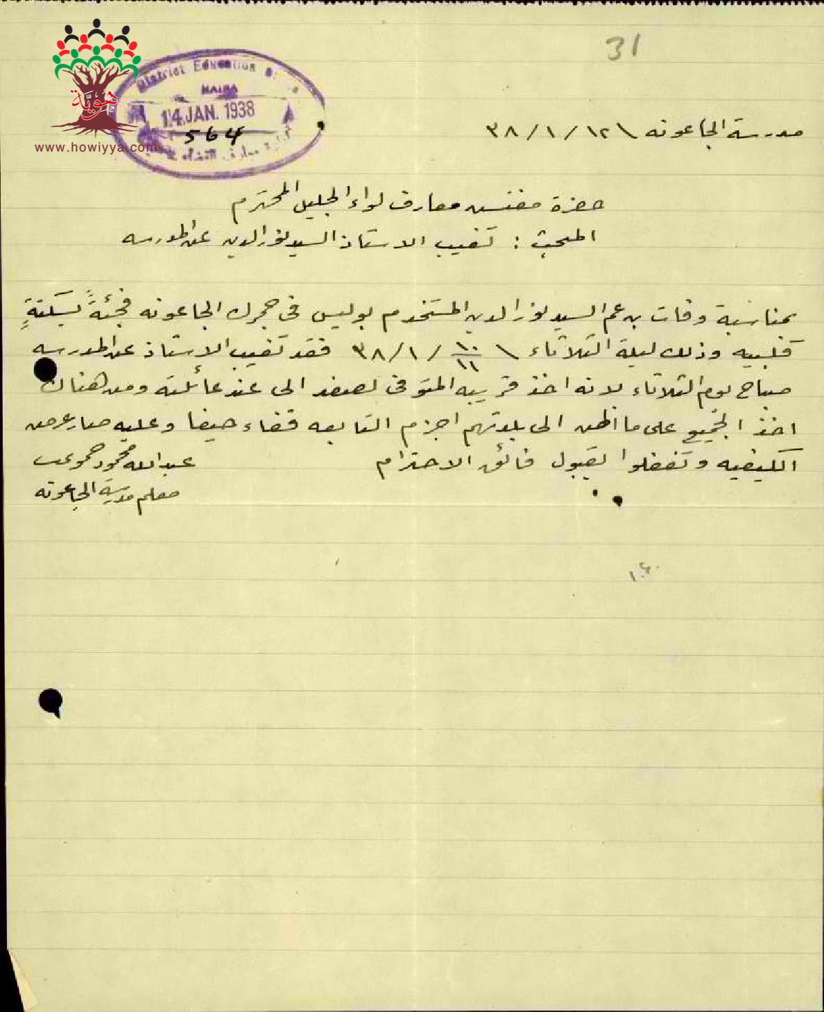 رسالة من مدير مدرسة الجاعونة الى مفتش المعارف بخصوص تغيب المعلم نور الدين ماضي بسبب وفاة ابن عمه