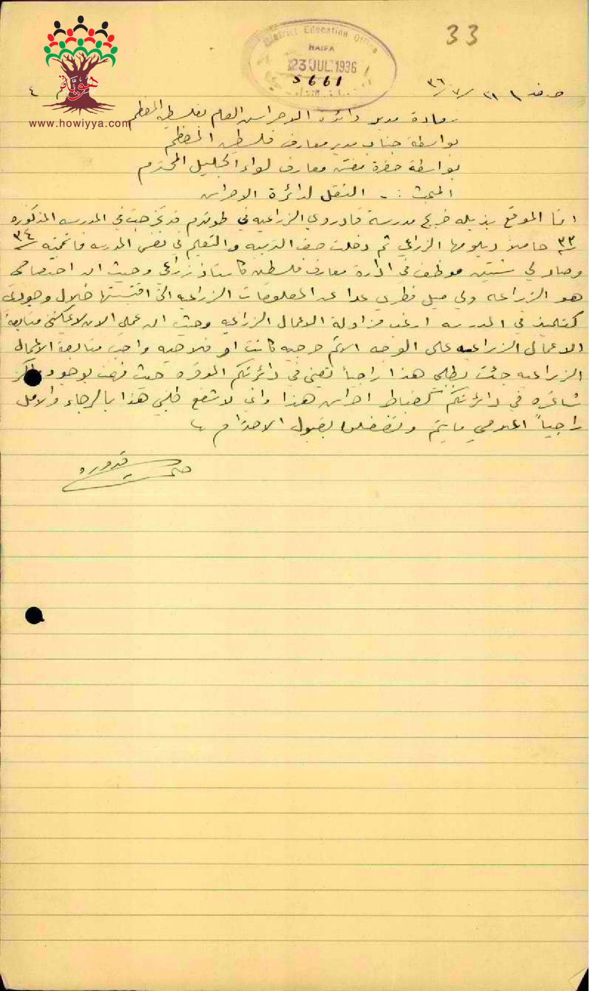 رسالة من المعلم حكمت قدورة الى مفتش المعارف يطلب فيها نقله من مدرسة الصفصاف الى دائرة الأحراش