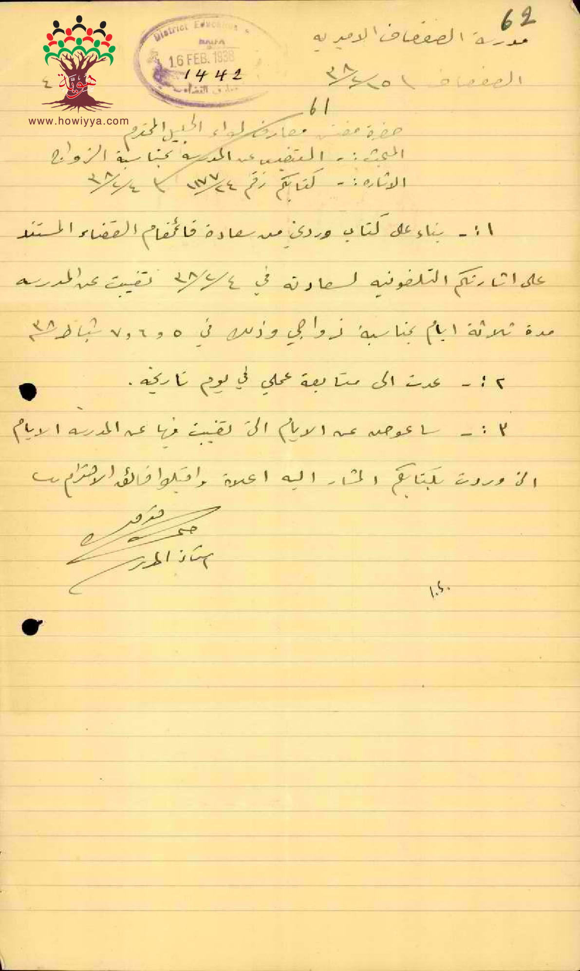 رسالة من المعلم حكمت قدورة الى مفتش المعارف يخبره بعودته الى العمل بعد اجازة الزواج