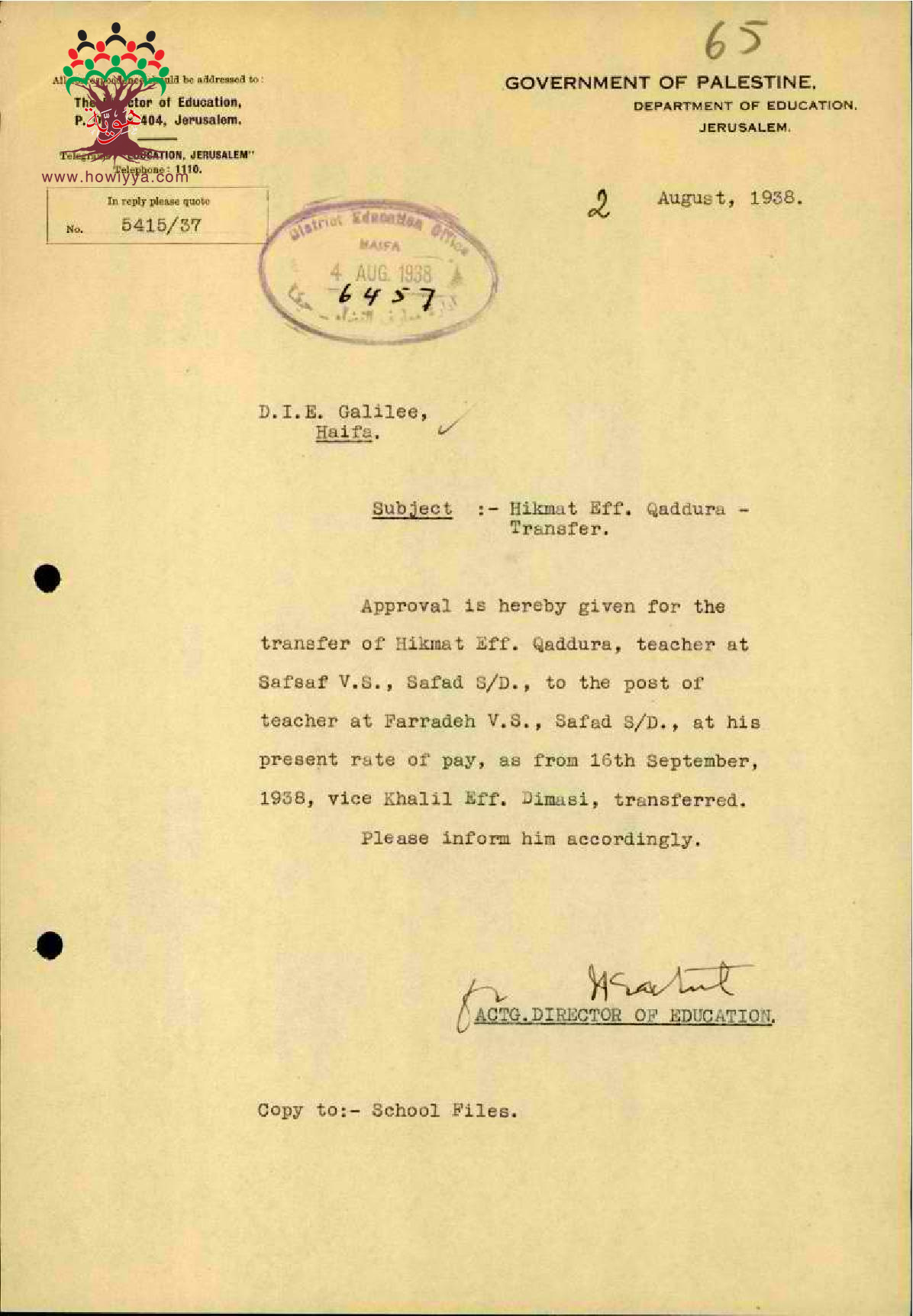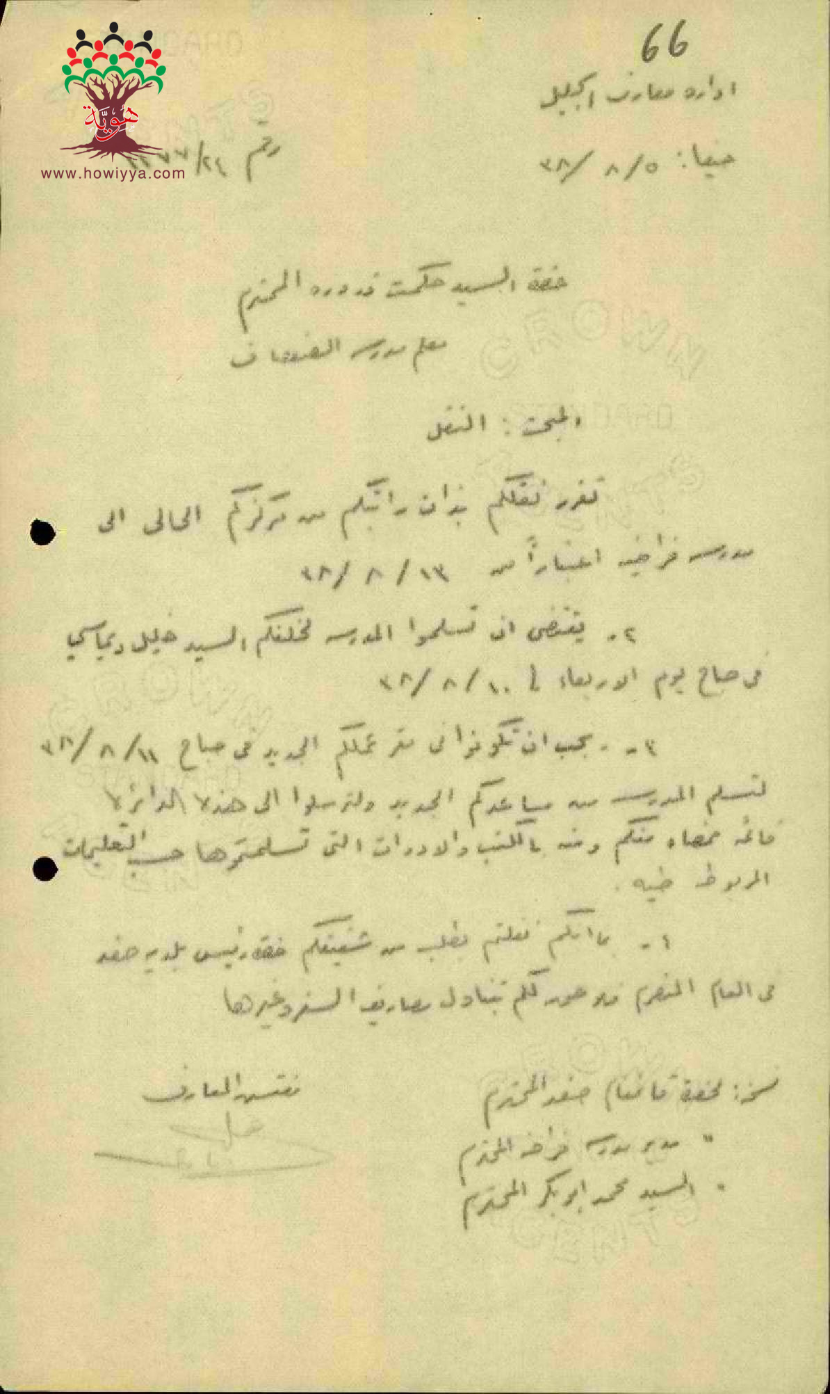 رسائل بخصوص نقل المعلم حكمت قدورة من مدرسة الصفصاف الى مدرسة فراضية