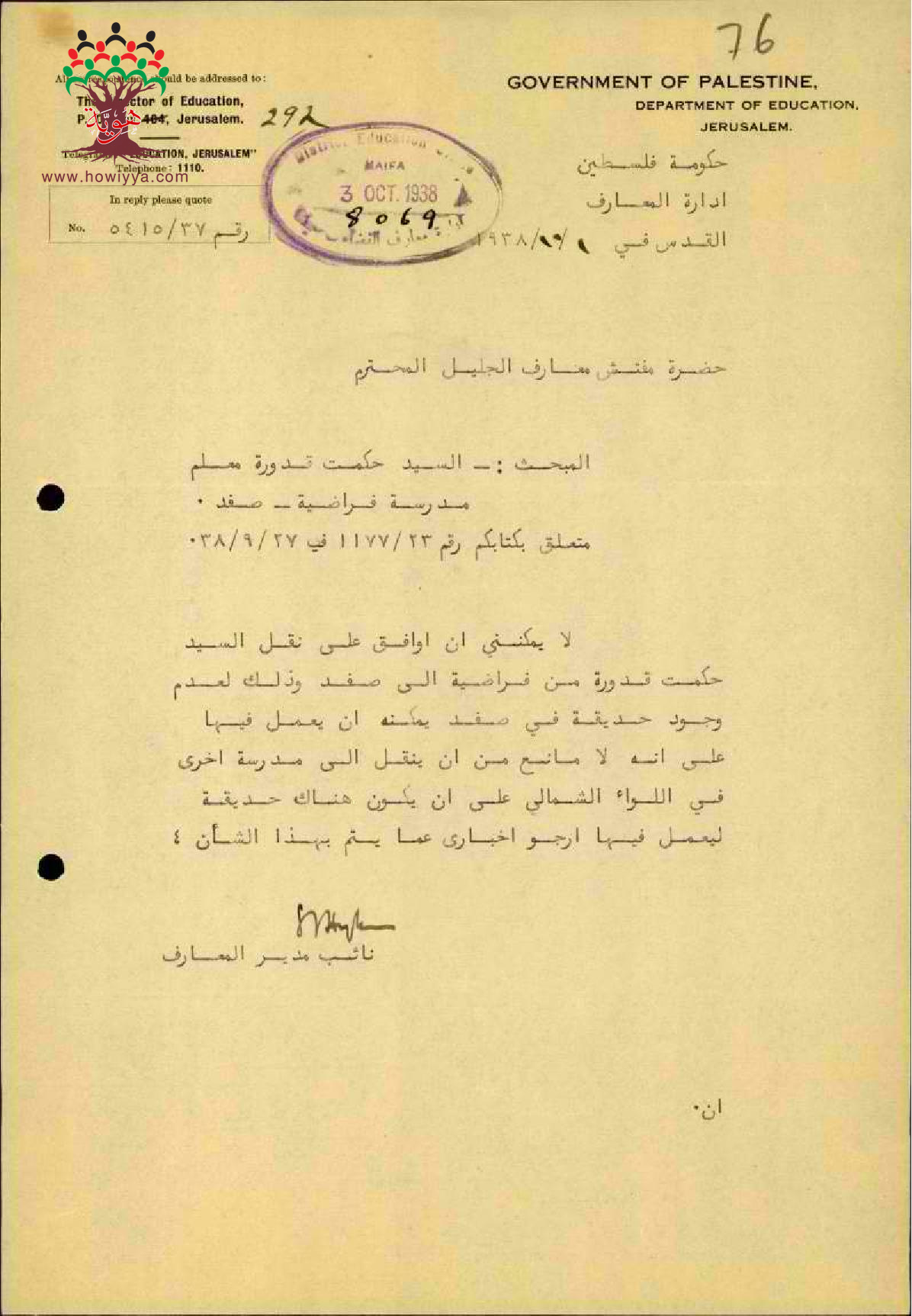 رسالة من مدير المعارف الى مفتش المعارف لإخباره بأنه لا يمكن نقله من فراضية الى صفد