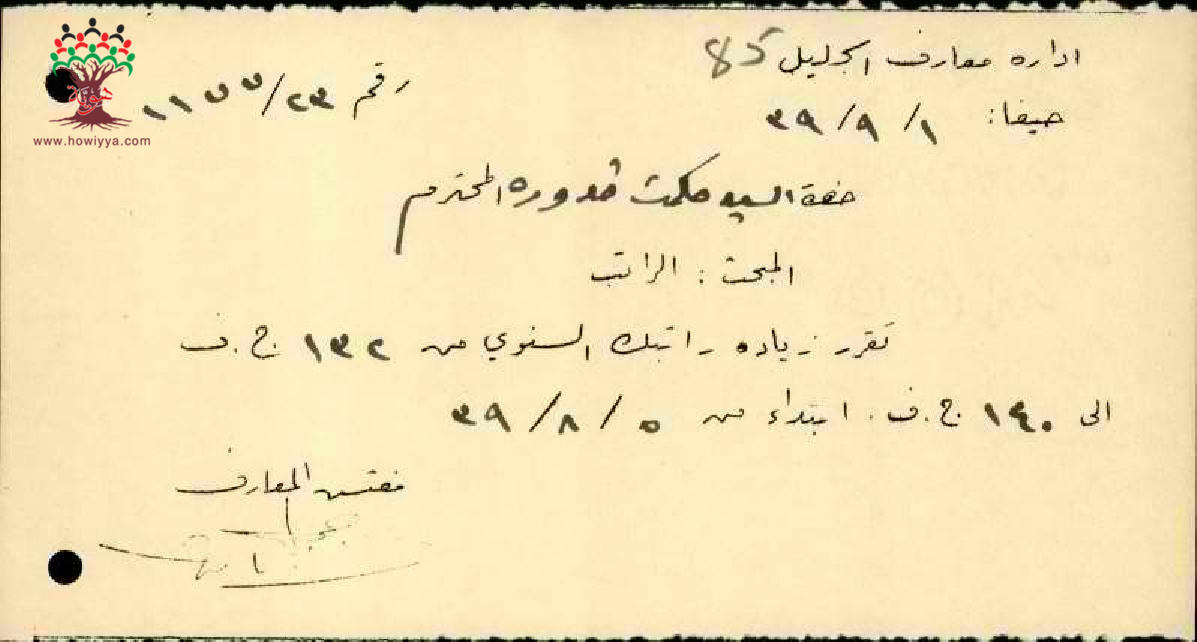 رسالة من مفتش المعارف الى المعلم حكمت قدورة بخصوص زيادة راتبه السنوية لسنة 1939