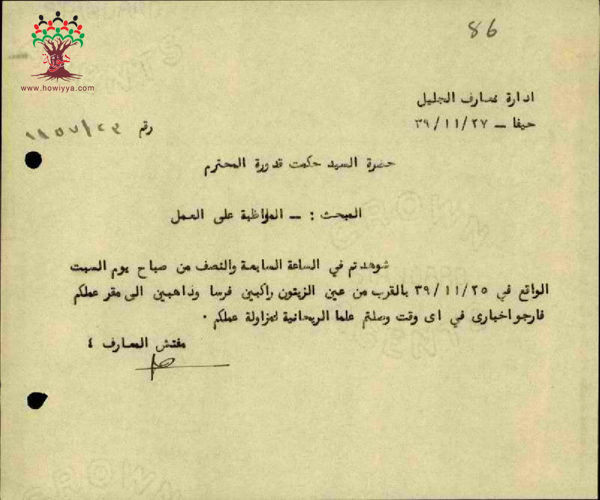 رسالة من مفتش المعارف الى المعلم حكمت قدورة يسأله عن وقت وصوله الى العمل