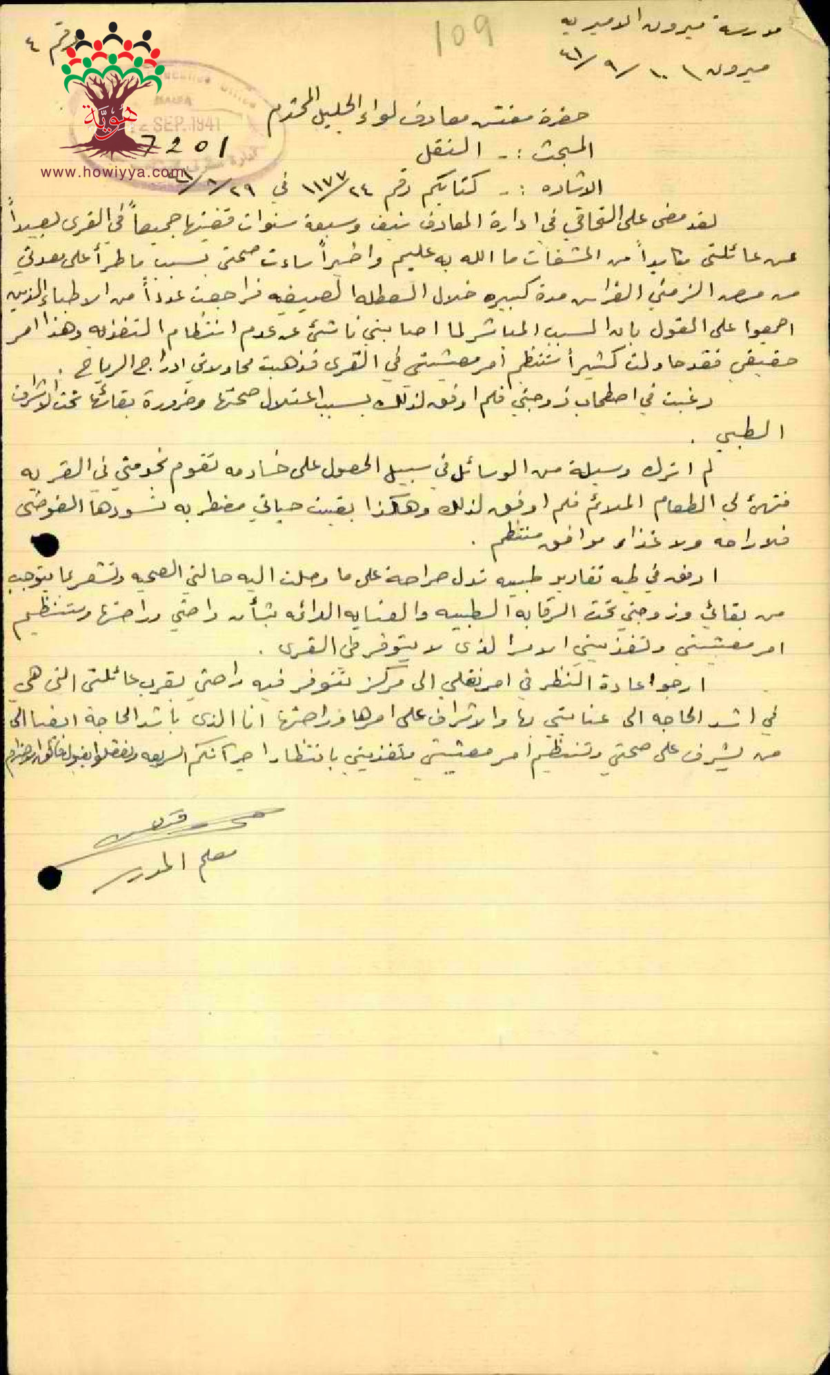 رسالة من المعلم حكمت قدورة الى مفتش المعارف يطلب فيها نقله من مدرسة الصفصاف
