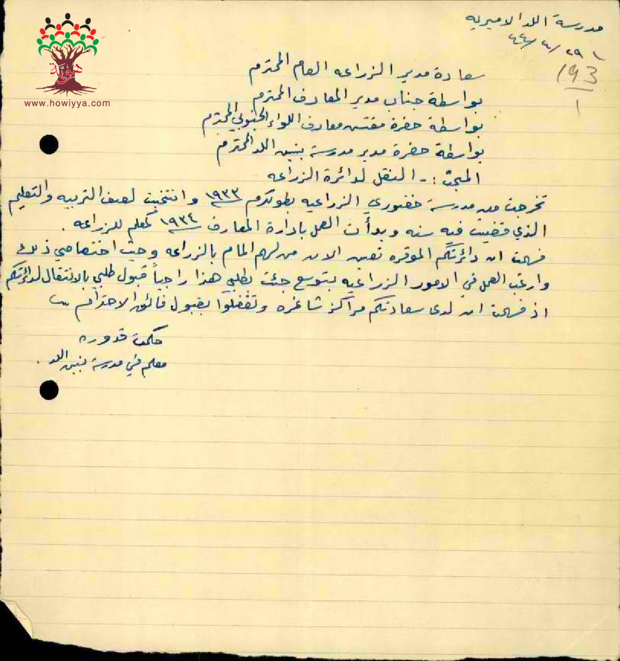 رسالة من المعلم حكمت قدورة الى مفتش المعارف يطلب فيها نقله الى دائرة الزراعة