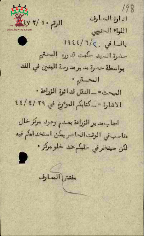 رسالة من مفتش المعارف الى المعلم حكمت قدورة يخبره بأنه لا يوجد مركز شاغر في دائرة الزراعة لنقله