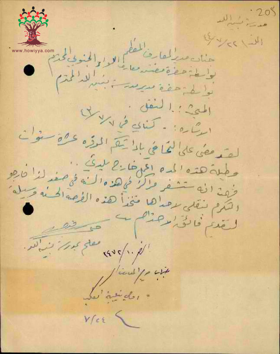 رسالة من المعلم حكمت قدورة الى مفتش المعارف يطلب فيها نقله من اللد الى الرملة