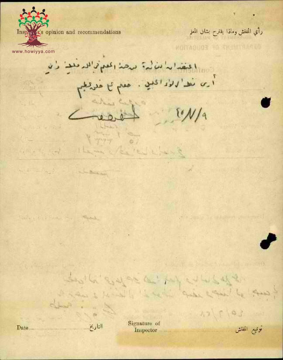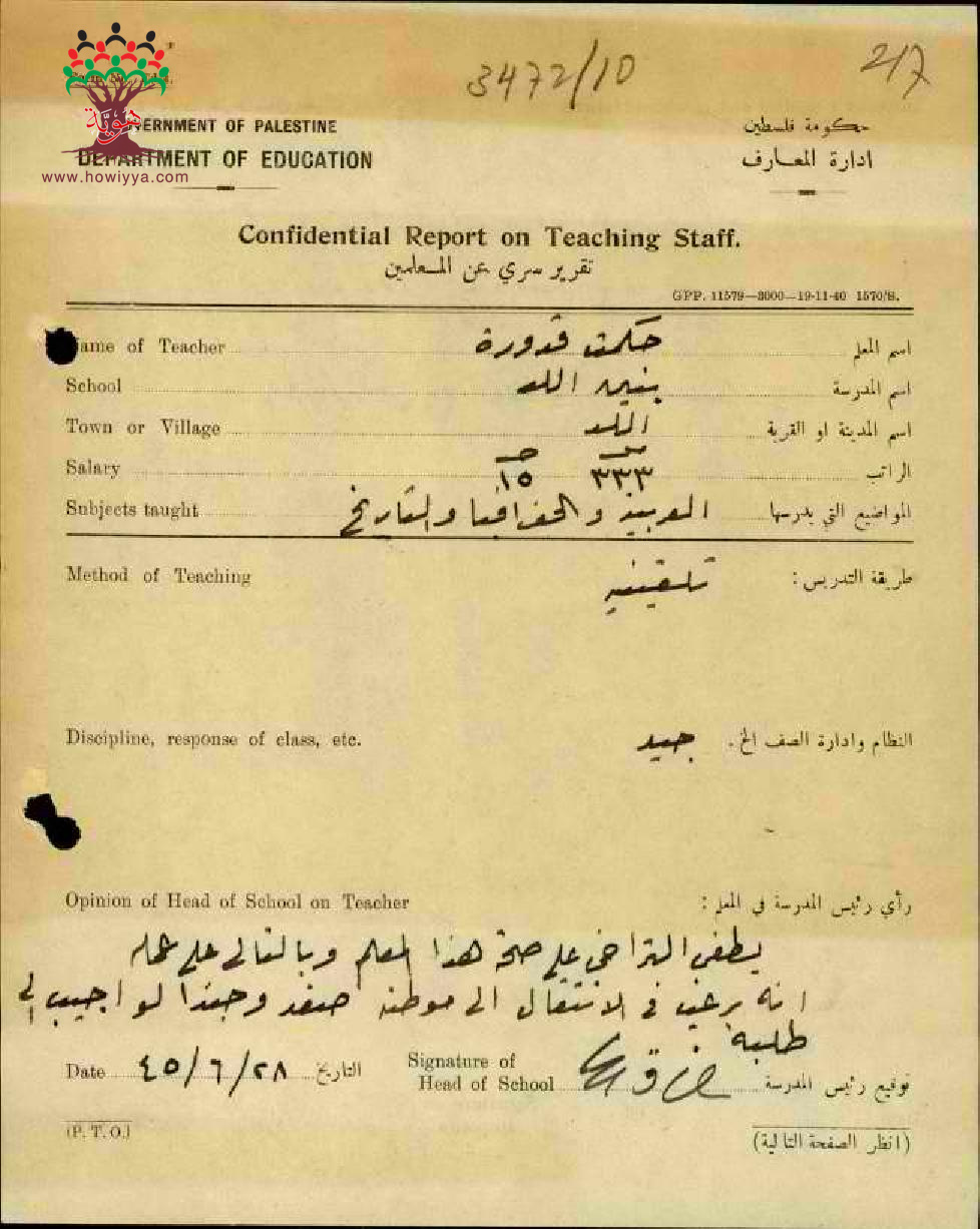 تقرير تفصيلي عن أداء المعلم حكمت قدورة في مدرسة اللد سنة 1945
