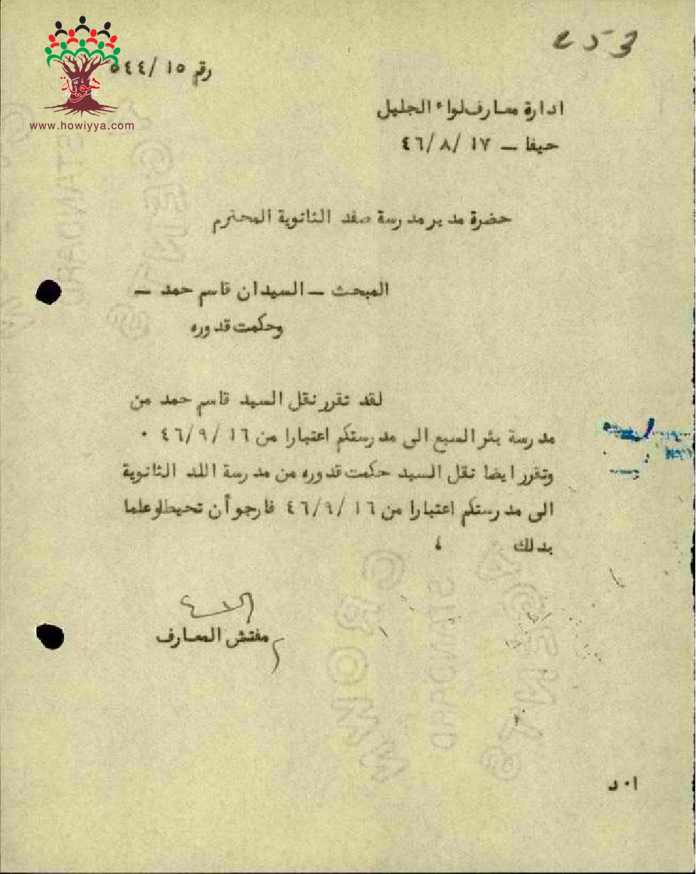 رسالة من مفتش المعارف الى مدير مدرسة صفد بخصوص تعيين المعلم حكمت قدورةه معلما فيها