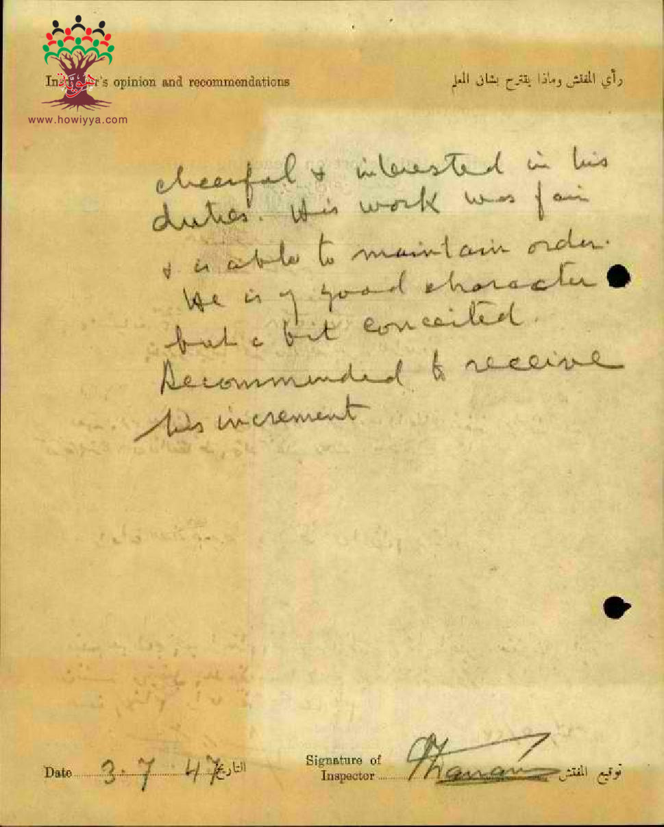 تقرير تفصيلي عن أداء المعلم حكمت قدورة في مدرسة صفد سنة 1947