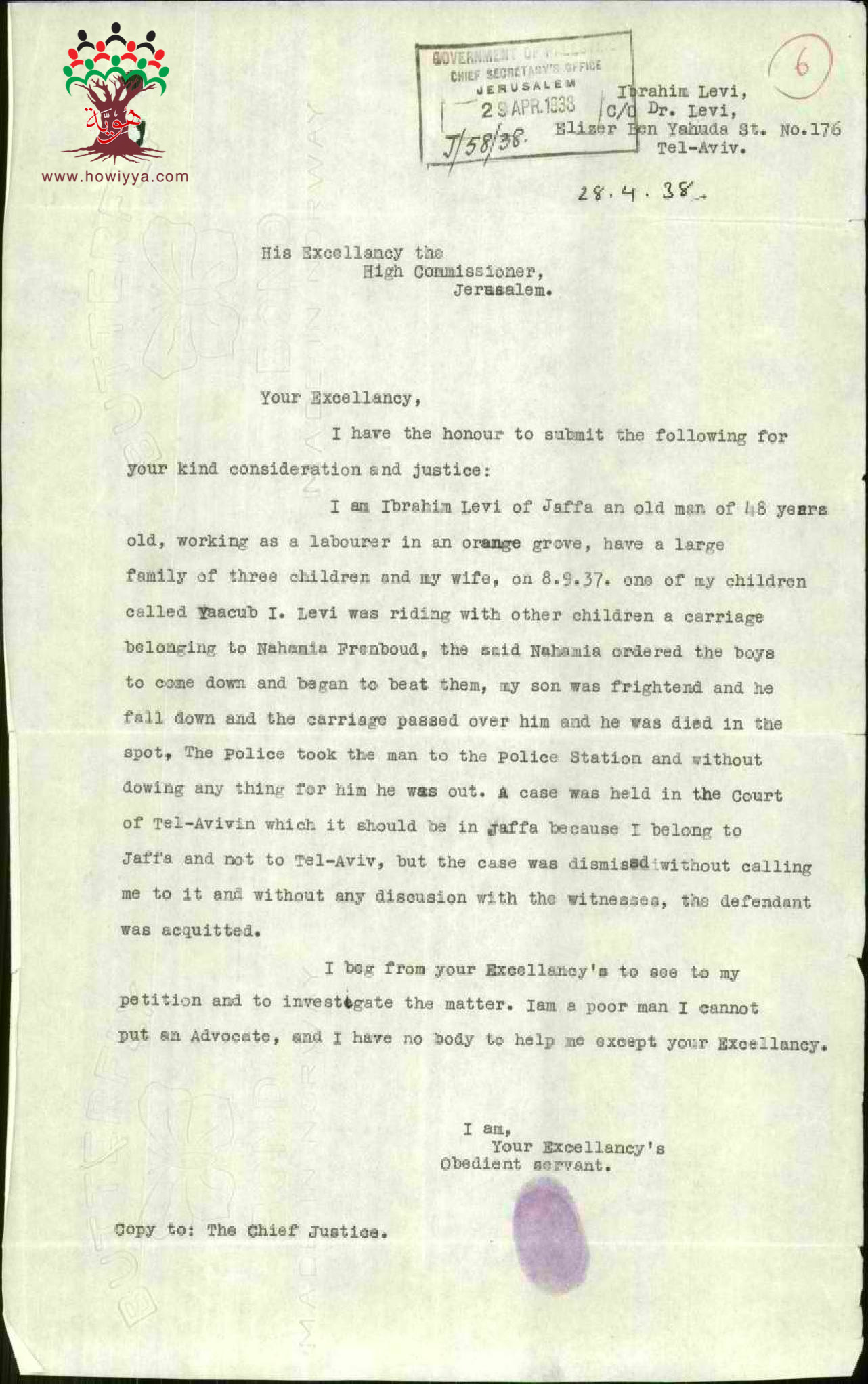 شكوى مقدمة من إبراهيم ليفي ضد نيهاميا فرينهود يتهمه بالتسبب في مقتل ولده يعقوب ليفي