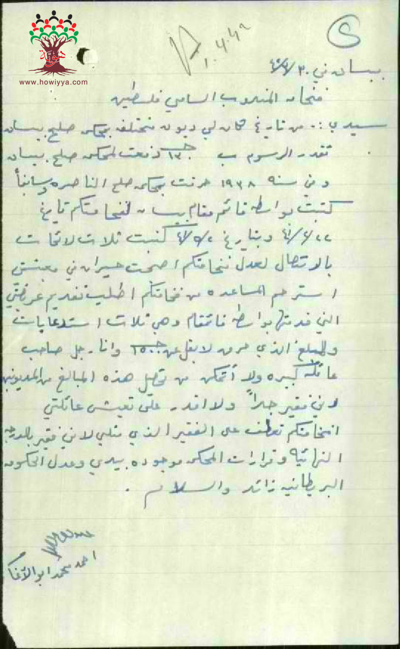 رسائل بخصوص التماس المقدم من أحمد محمد أبو الآغا الى المندوب السامي بخصوص ديونه المتخلفة بحكم صلح بيسان