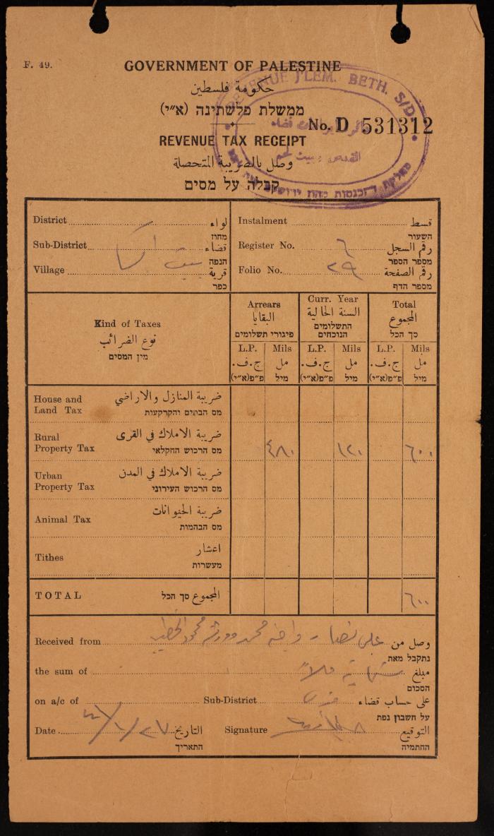 وصل بالضريبة المحصلة من علي نصار محمود الخطيب واخيه محمد ووريثه محمود الخطيب على أملاكهم في قرية بيت اكسا بقيمة 600 ملا
