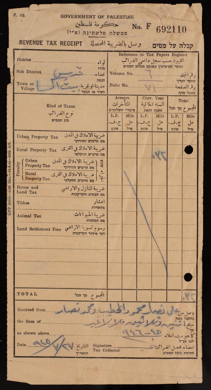 وصل بالضريبة المحصلة من علي نصار محمود الخطيب ومحمد نصار على أملاكهم في قرية بيت إكسا بقيمة 32 ملا