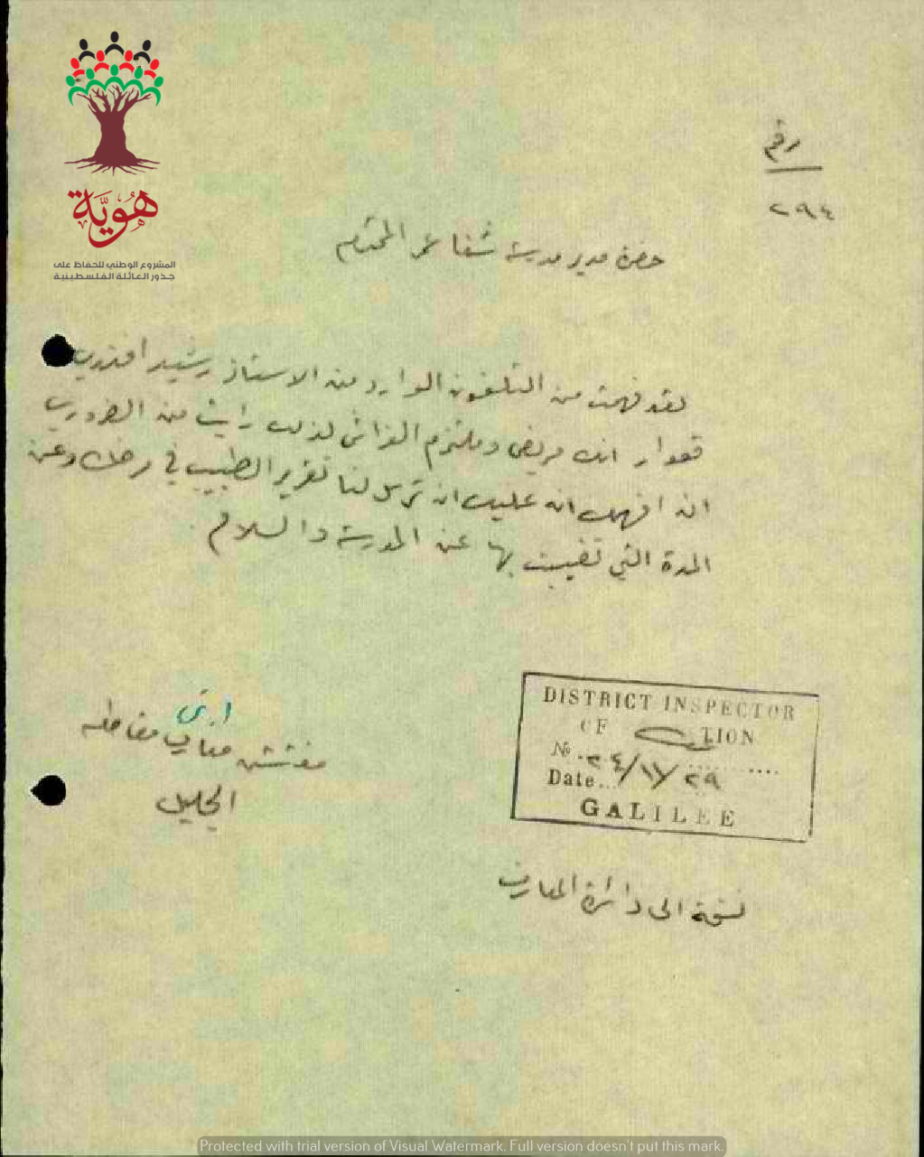 رسالة من مفتش المعارف الى المعلم هاني أبو مصلح يطلب منه ارسال تقرير لتغيبه عن العمل بسبب المرض