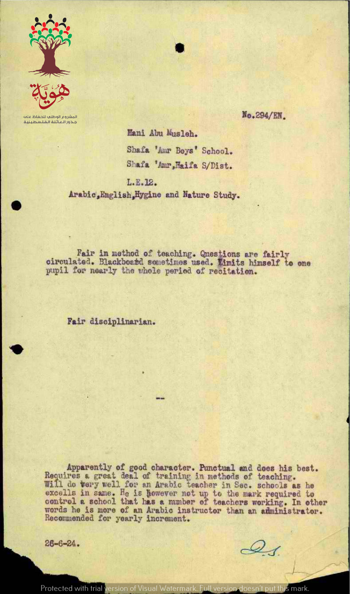 تقرير عن أداء المعلم هاني أبو مصلح في مدرسة شفا عمرو