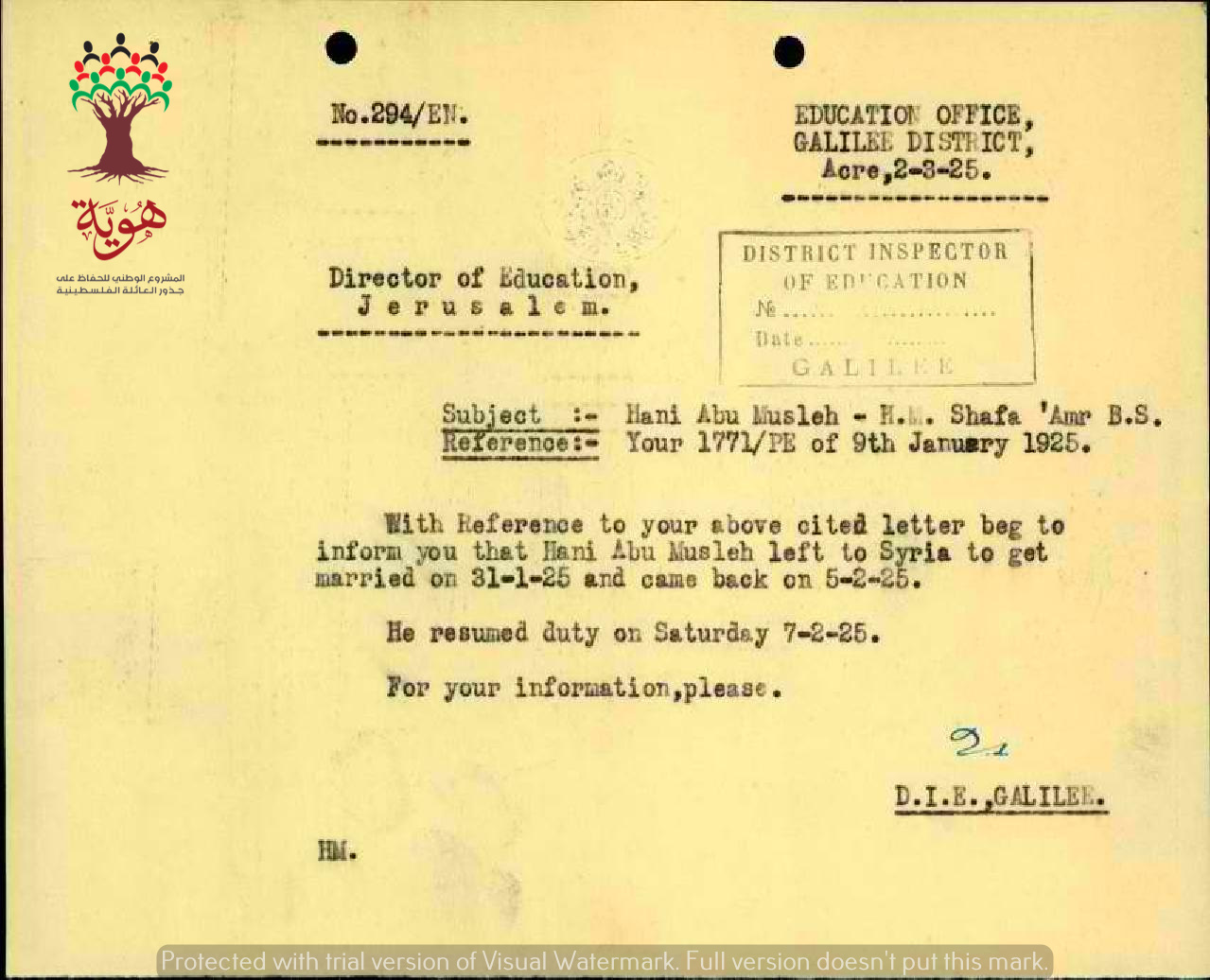 رسالة من مفتش المعارف الى مدير المعارف يخبره بمغادرة المعلم هاني أبو مصلح الى سوريا بهدف الزواج