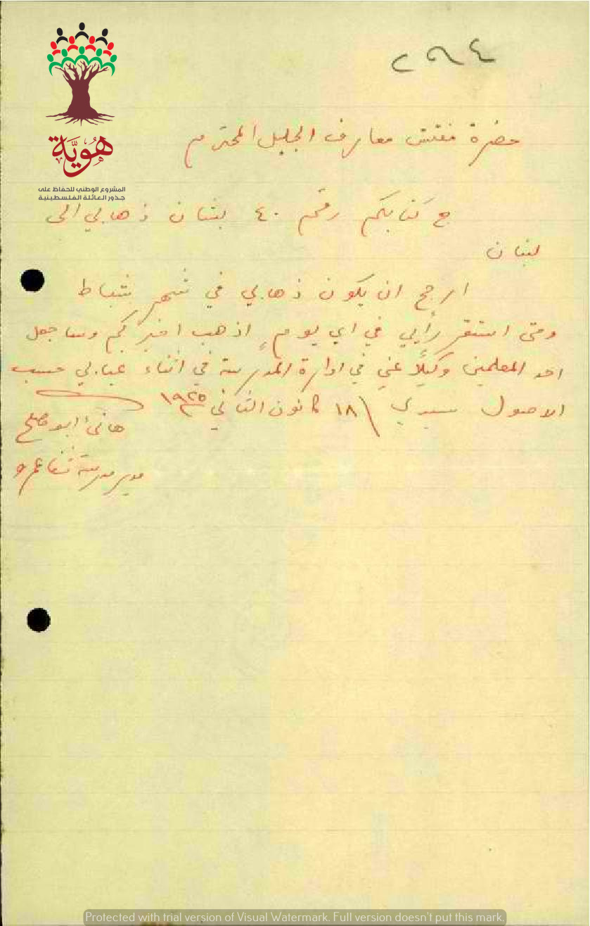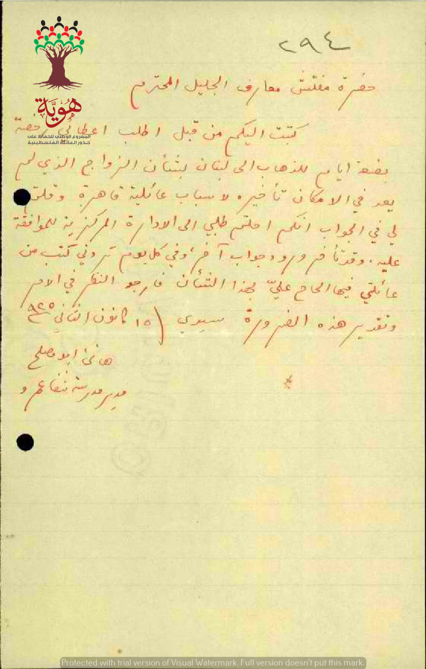 رسائل من المعلم هاني ابو مصلح الى مفتش المعارف بخصوص مغادته للزواج