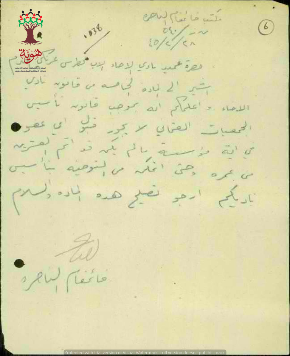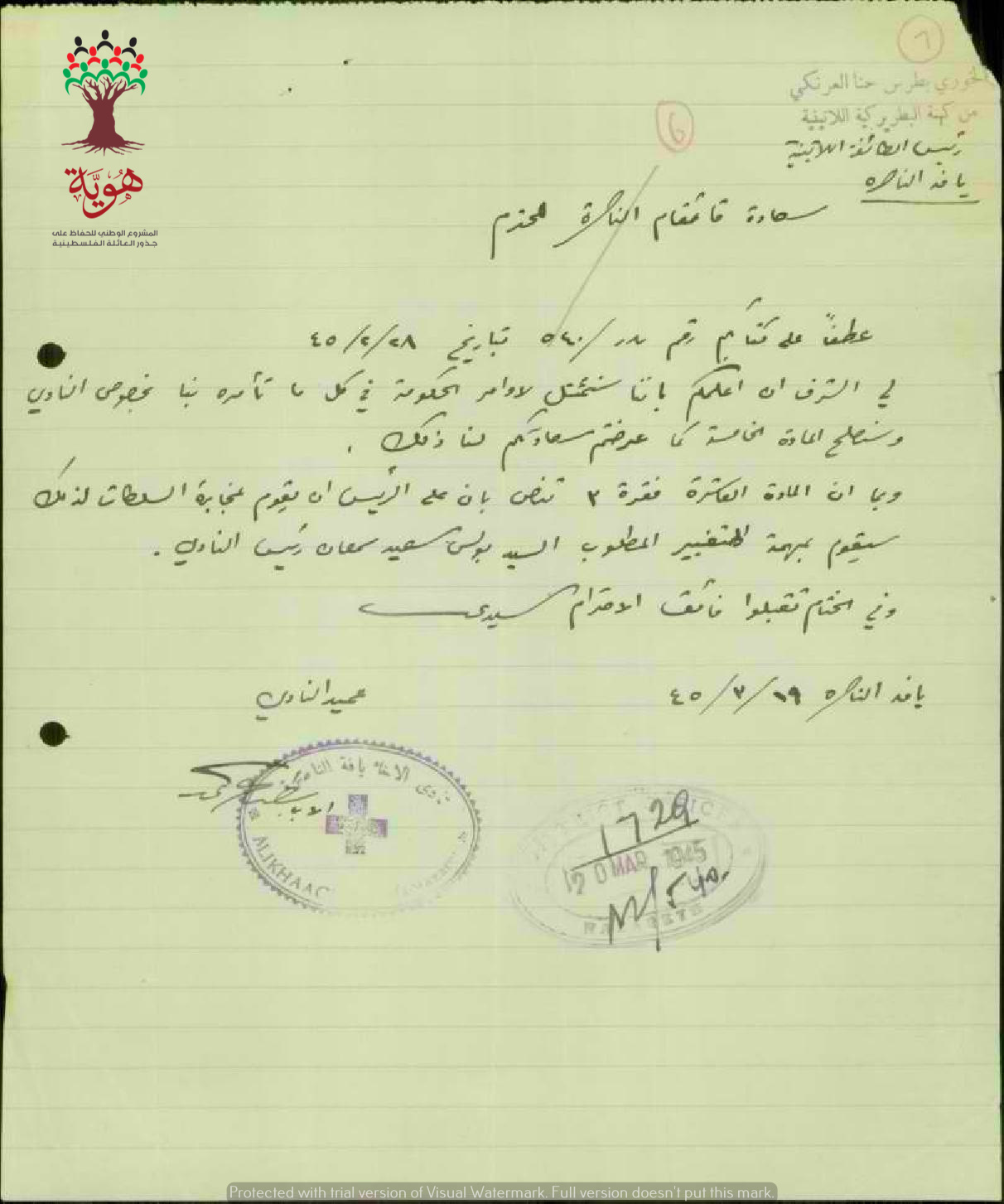 رسائل بين قائمقام الناصرة و عميد نادي الإخاء في يافة الناصرة بخصوص تعديل المادة الخامسة من قانون النادي حيث يمنع عضوية أي شخص تحت العشرين عام من العمر
