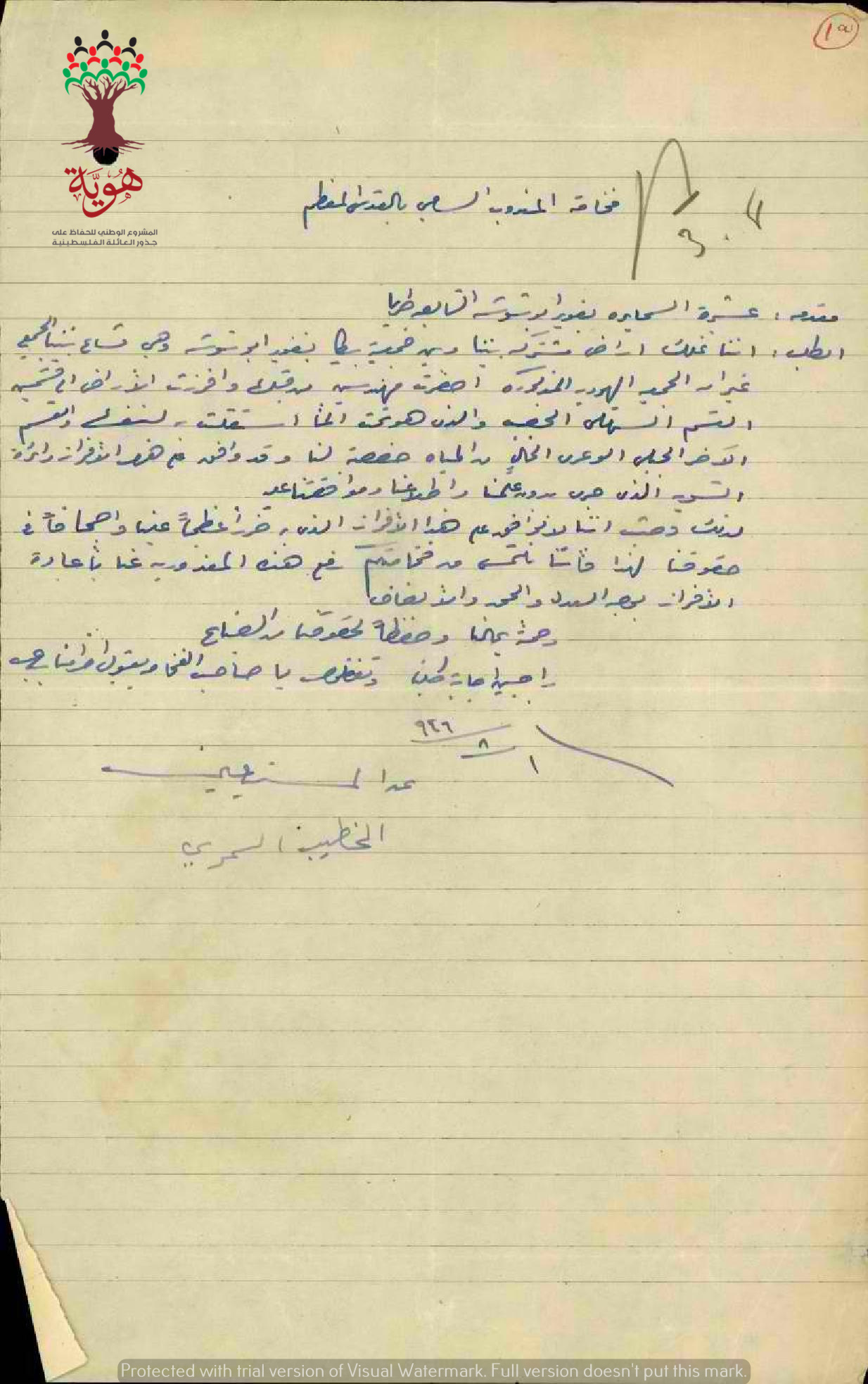 الخطيب السمري بالنيابة عن عشيرة السمايرة في غوير أبو شوشة يقدم اعتراضاً على إفراز شركة بيكا لأراضي المشاع، بحيث تم إعطاء القسم الخصب للشركة اليهودية والقسم الصخري لعشيرة السمايرة..